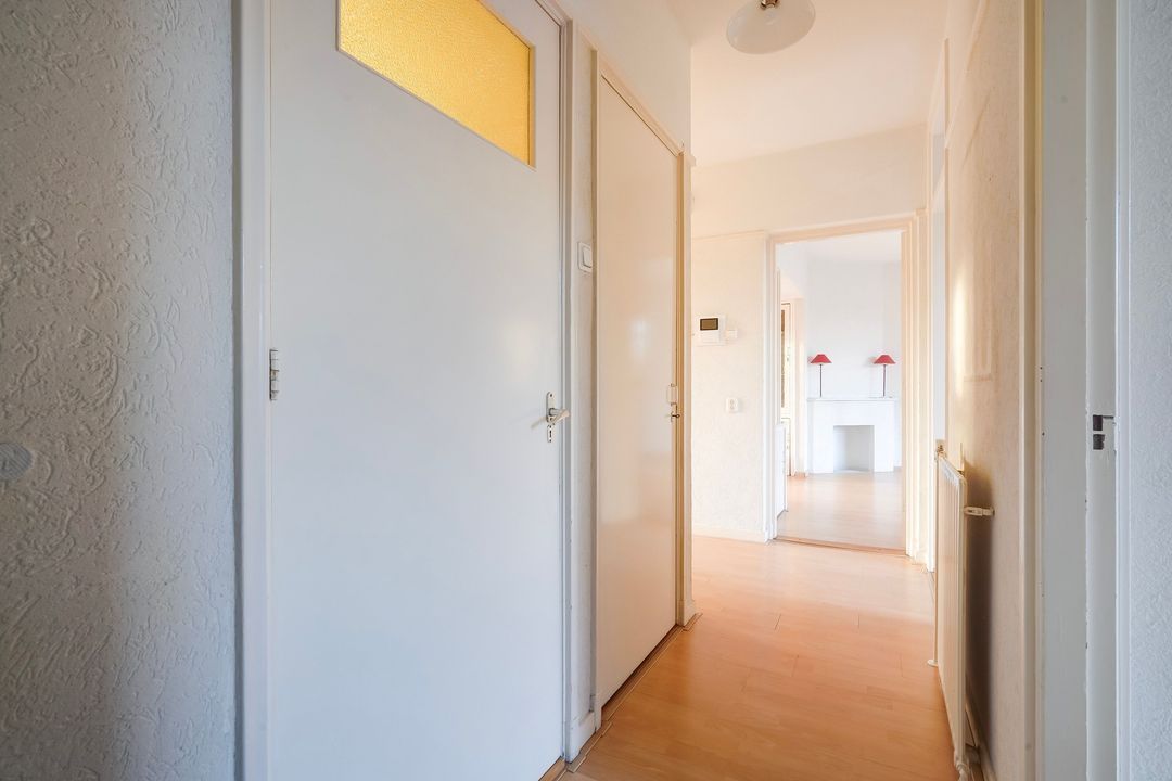 Apartment entrance, L-shaped hallway with access to all rooms, the meter cupboard and a separate toilet with a hand basin. Fully tiled bathroom with a shower, sink, mirror cabinet and washing machine connection.