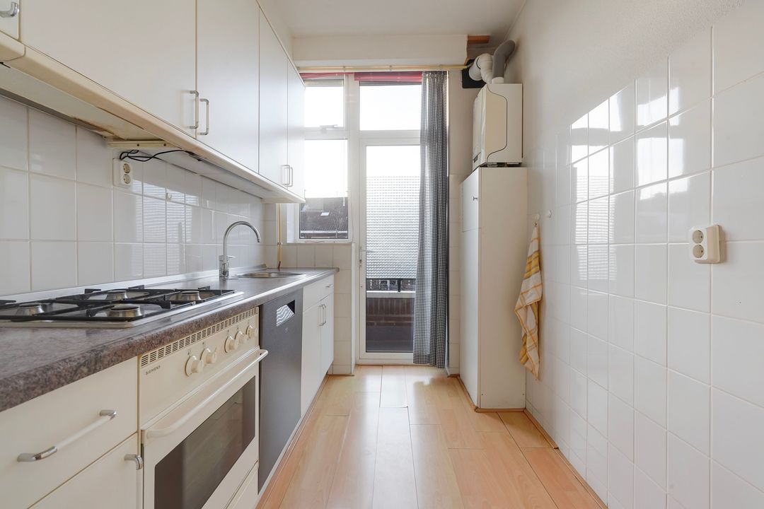 Dichte goed onderhouden keuken voorzien van een 4-pits gasfornuis, oven, afzuigkap, koel/vriescombinatie, vaatwasser, opstelplaats cv-ketel en tevens deur naar achterbalkon.