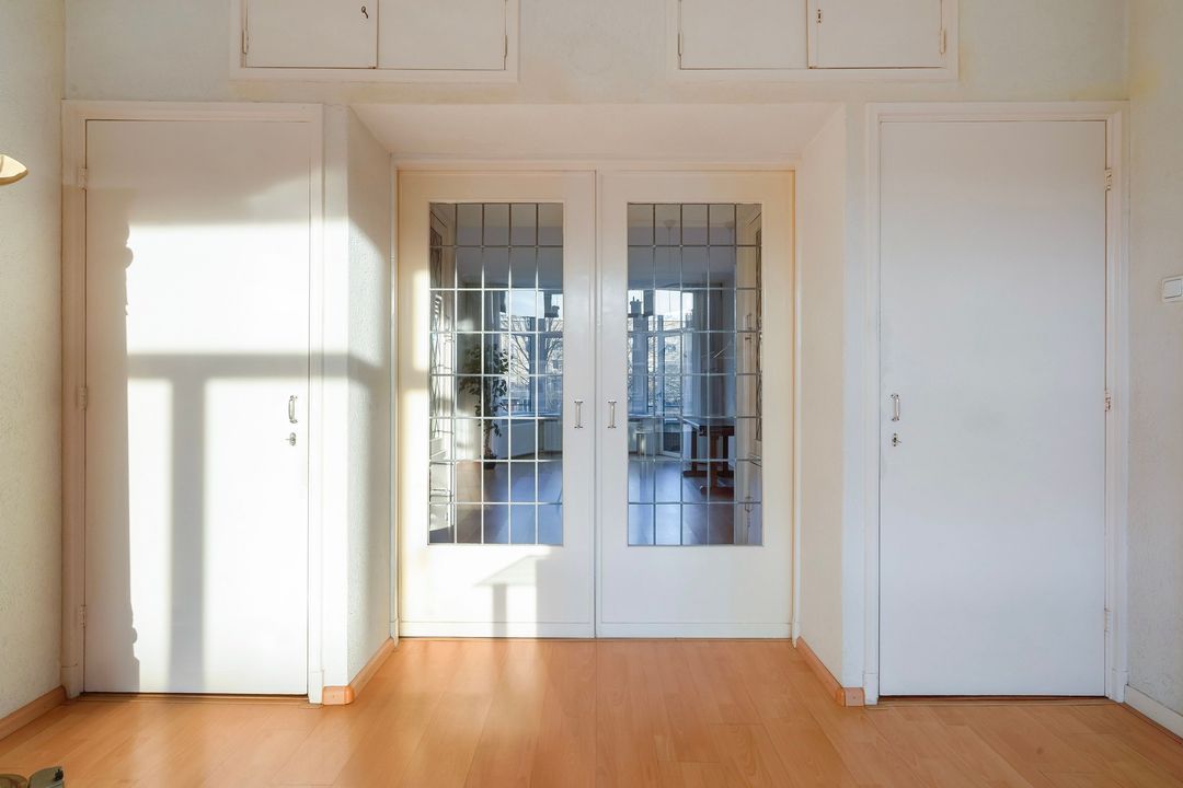 Beautiful en-suite living room (length approx. 11.30 meters) with original sliding doors with stained glass, four built-in wardrobes (two of which have stained glass), a characteristic bay window with unobstructed views and a door to the front balcony, facing northwest and enjoying the evening sun.
