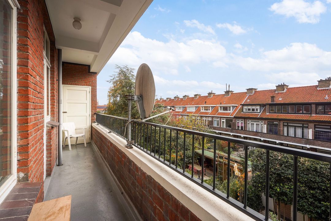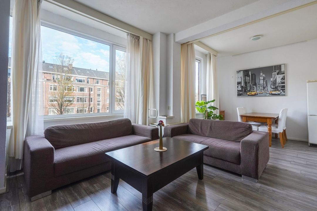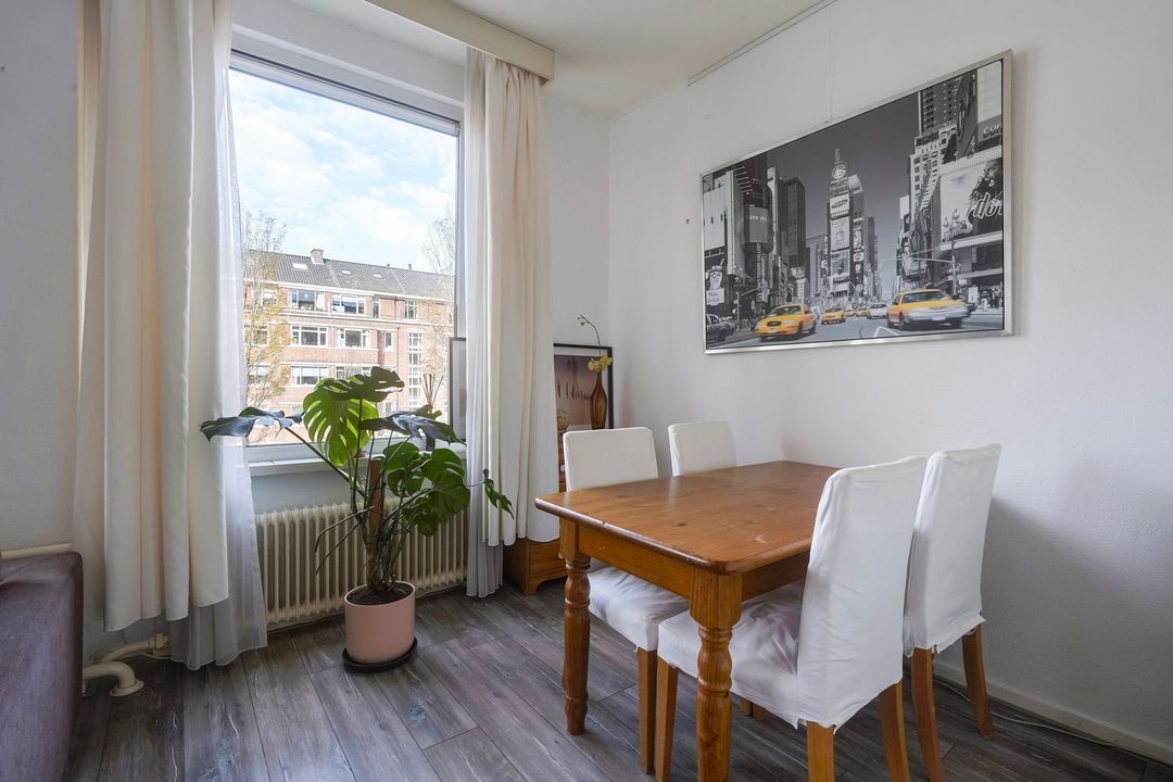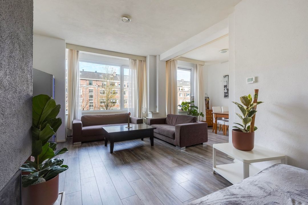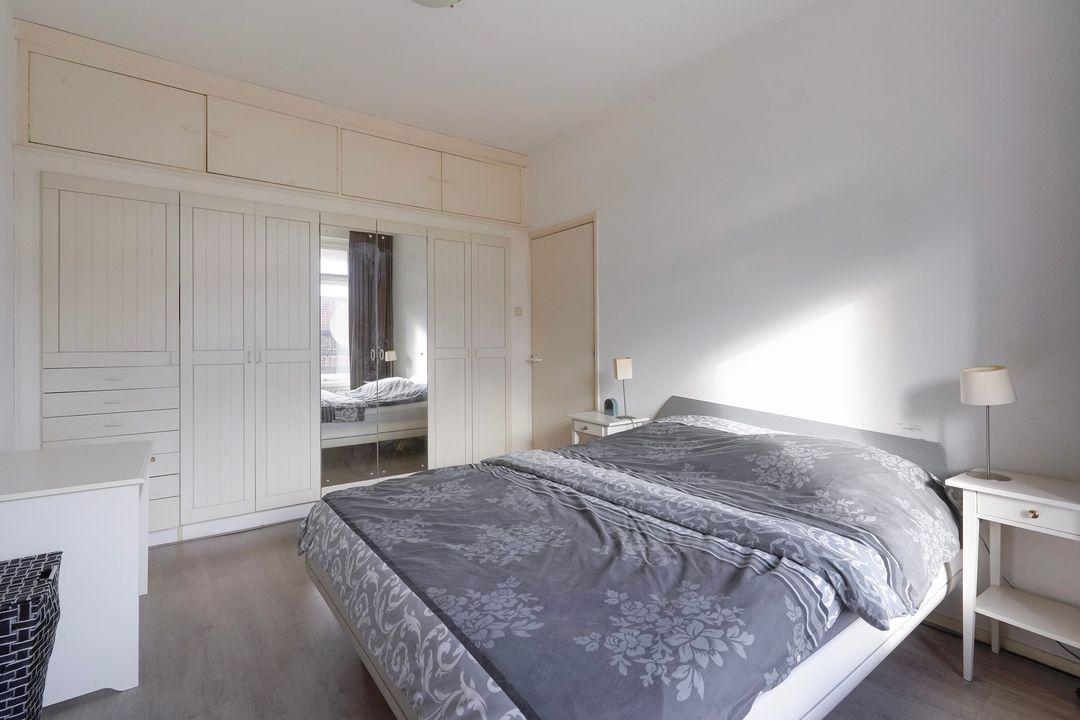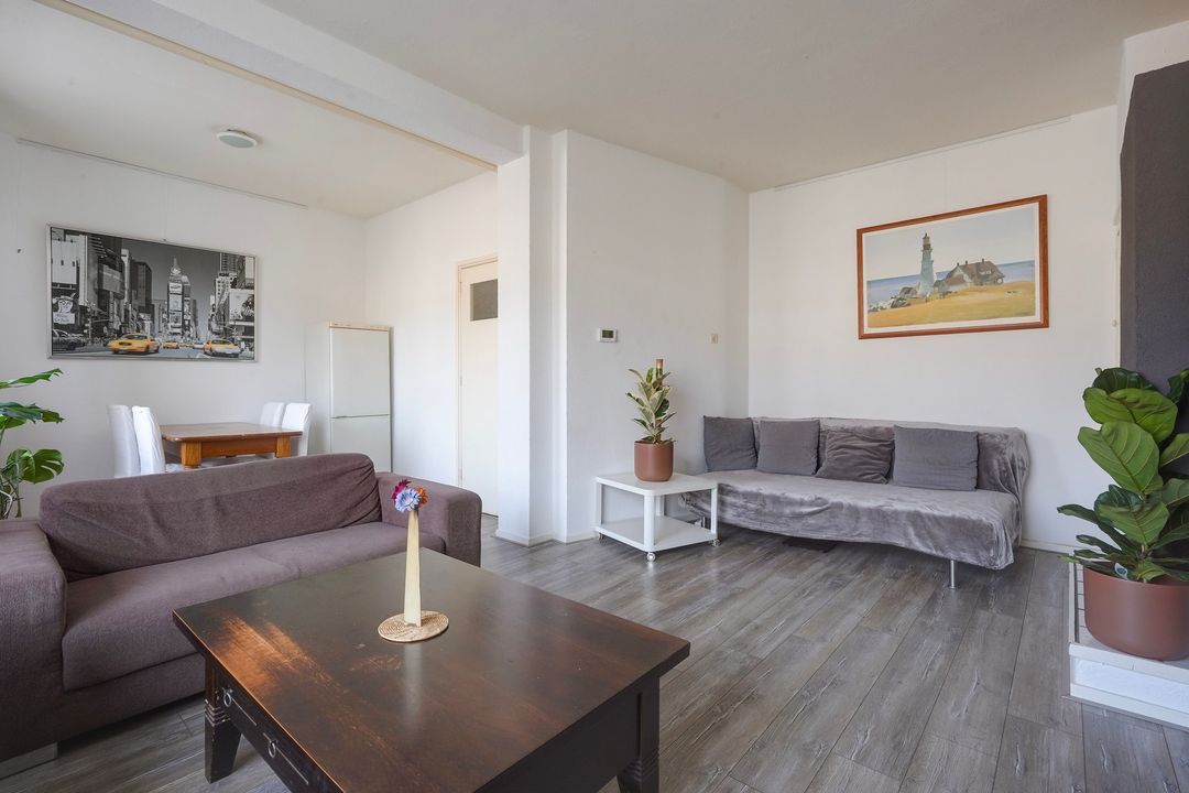 L-vormige woon-/eetkamer aan de voorzijde met erker, ruime achterslaapkamer met kastenwand en toegang naar het balkon.