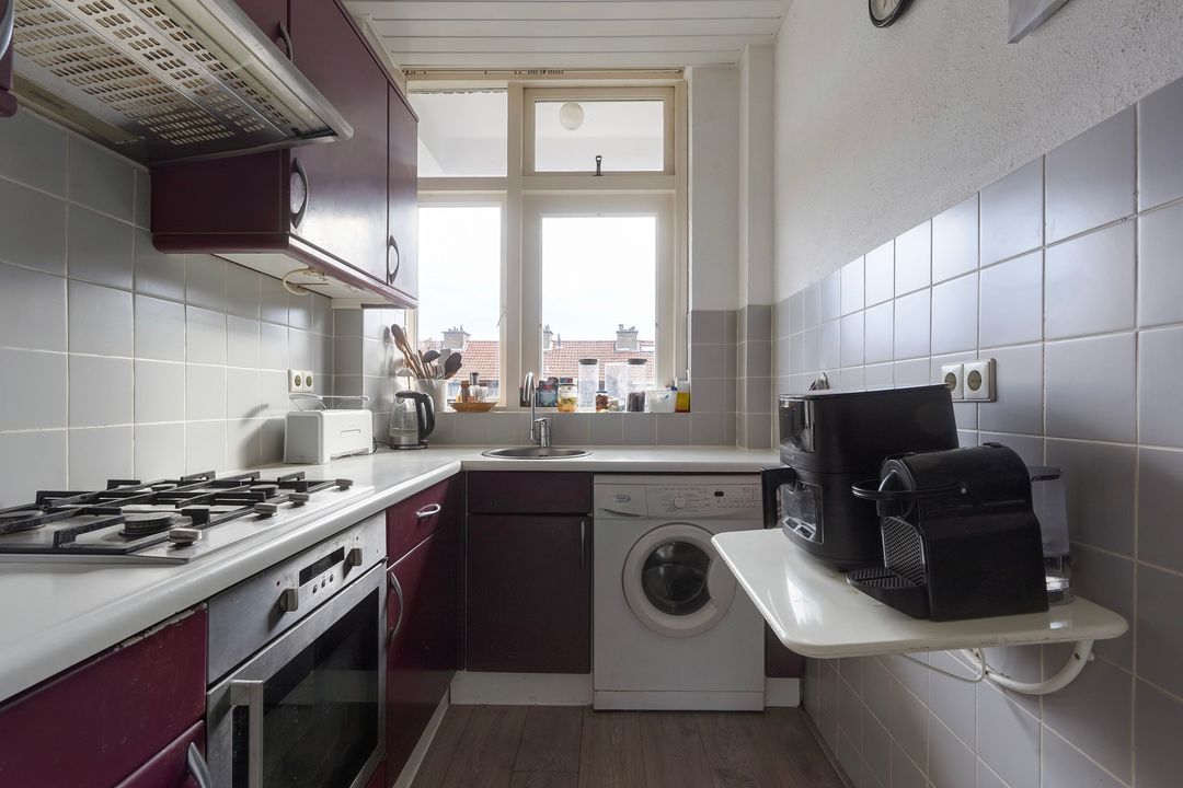 Tussengelegen keuken met eenvoudig keukenblok voorzien van 4-pits gasfornuis, oven en aansluiting voor de wasmachine.
