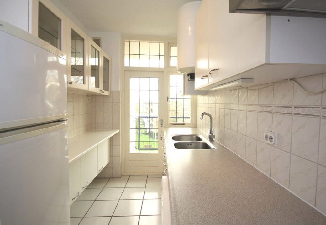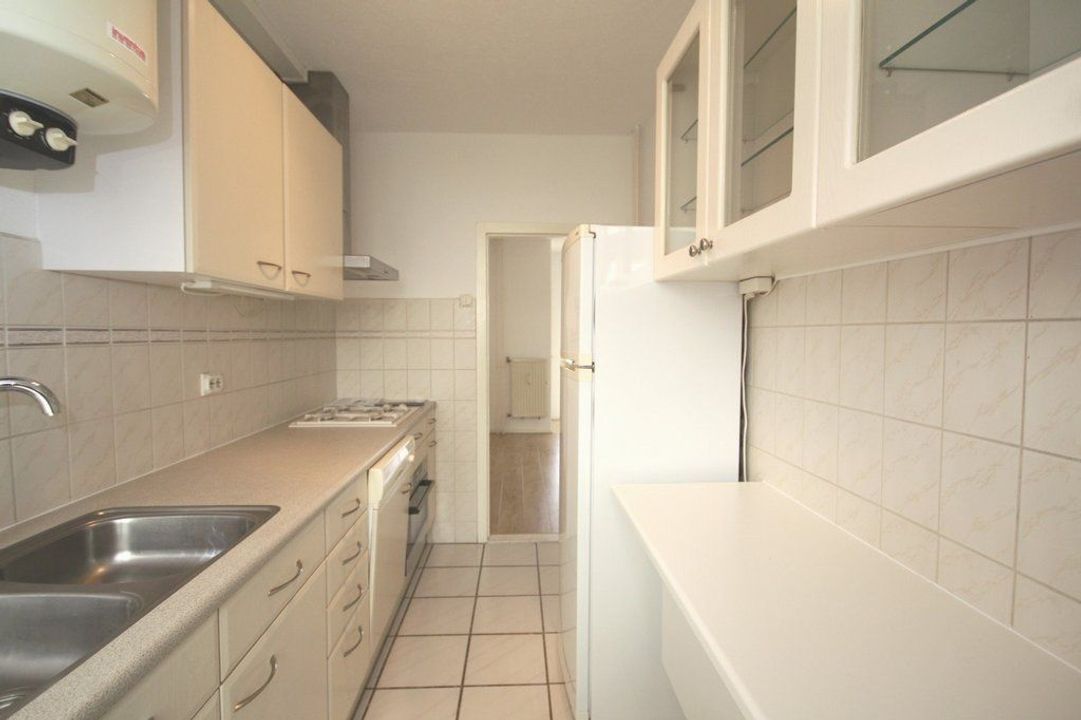 Nette keuken met diverse apparatuur en toegang tot het balkon, moderne badkamer met douche, wastafelmeubel en wasmachine-/droger combinatie.