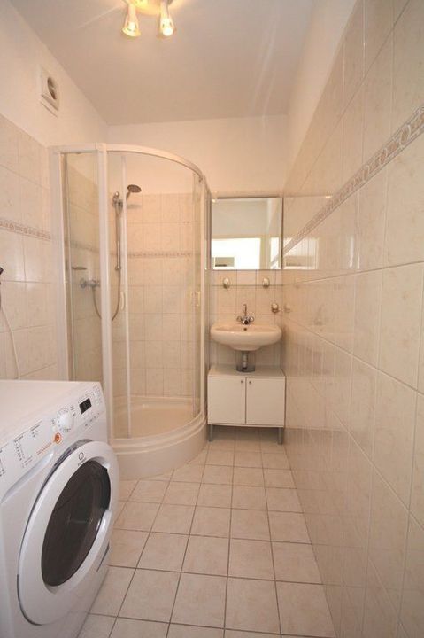 Neat kitchen with appliances and access to the balcony, modern bathroom with shower, wash basin and washer / dryer combination.