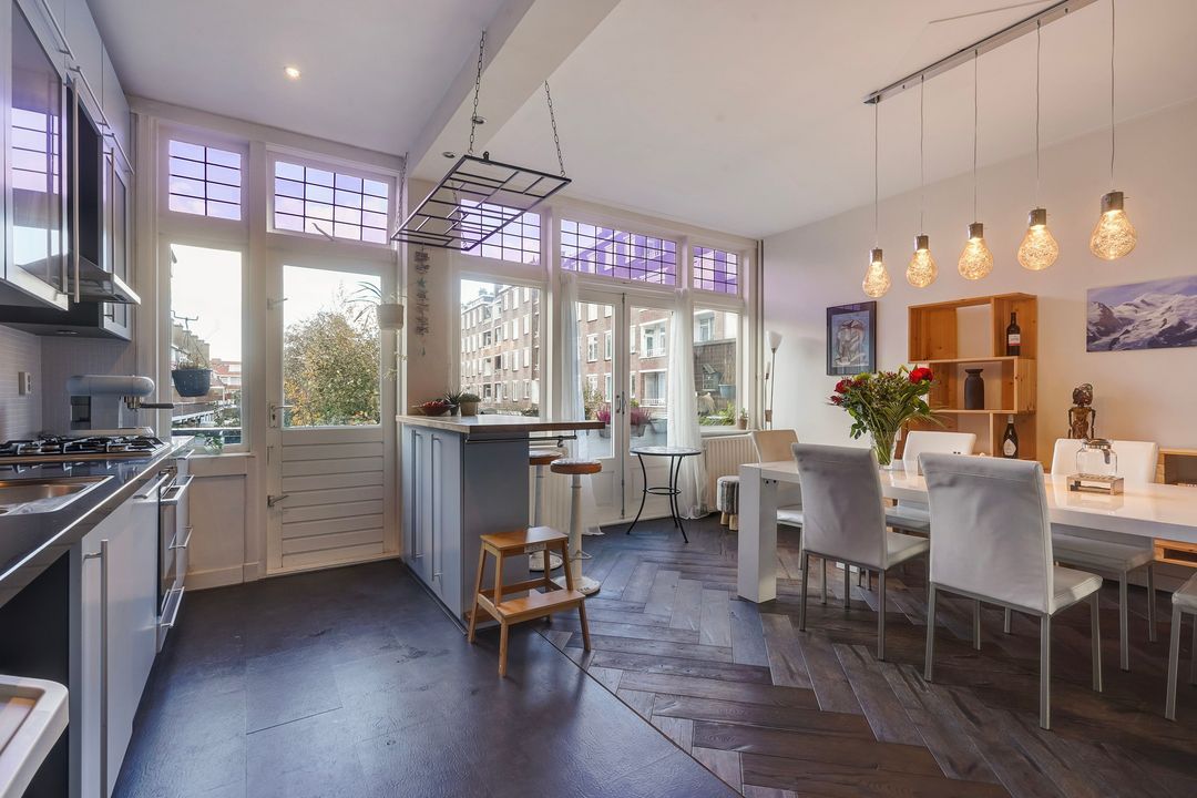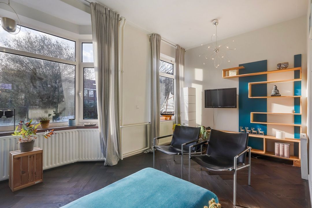 Met behoud van veel originele details een licht en goed onderhouden 3-laags bovenhuis (ca. 163 m2) voorzien van L-vormige woonkamer en suite met open keuken, 5 slaapkamers, 2 balkons over de gehele breedte en een separate (fietsen)berging.