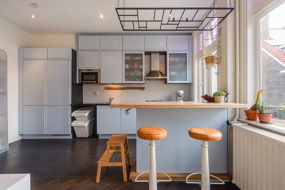 Sfeervolle, lichte en L-vormige originele kamer en suite met glas in lood deuren, 4 vaste kasten, marmeren schouw, bijgetrokken voorzijkamer, voorerker met vrij uitzicht over het water en half open keuken met barblad aan de achterzijde, voorzien van composiet aanrechtblad, dubbele spoelbak, 4-pits gasfornuis, inbouwoven, koel/vriescombinatie, inbouwmagnetron en opstelplaats cv-ketel.