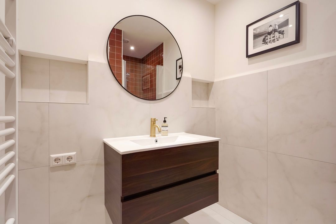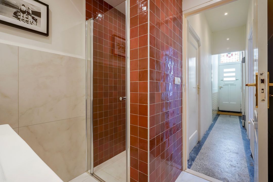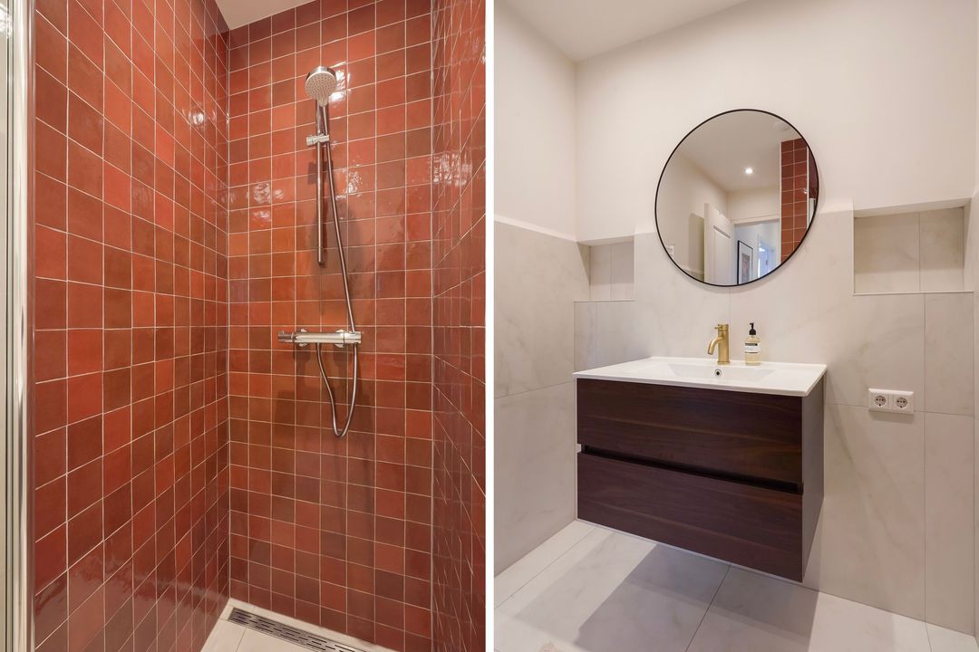 Luxe fraai betegelde badkamer voorzien van ruime inloopdouche, wastafelmeubel en designradiator.