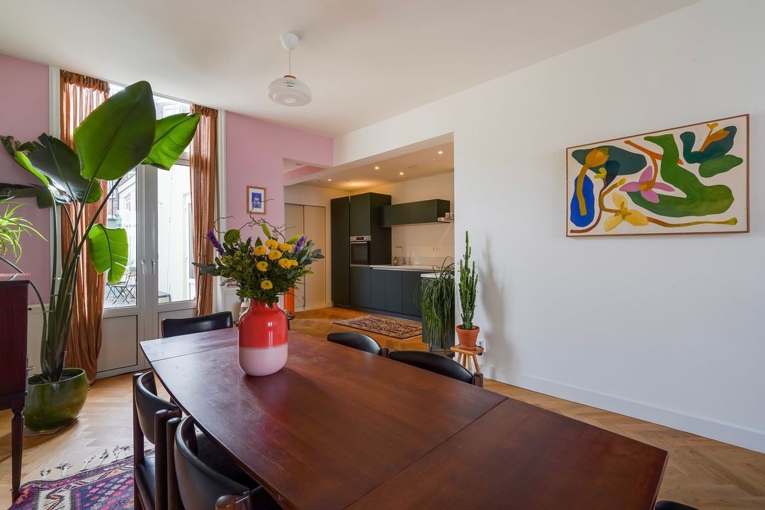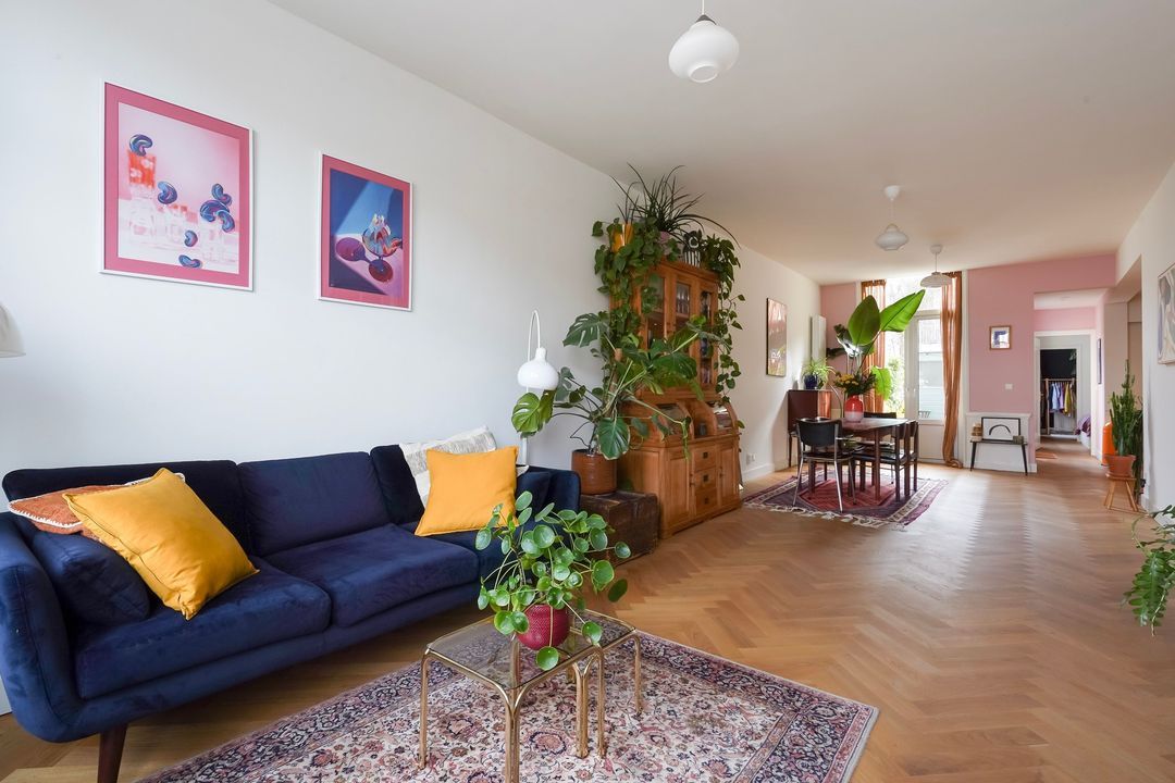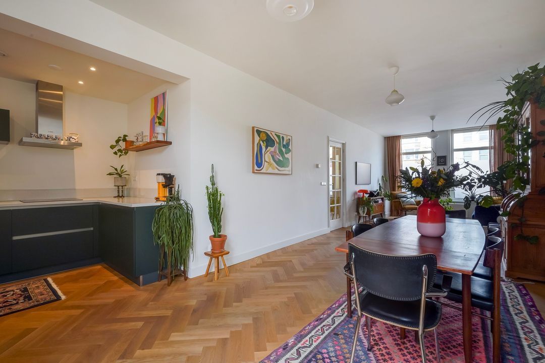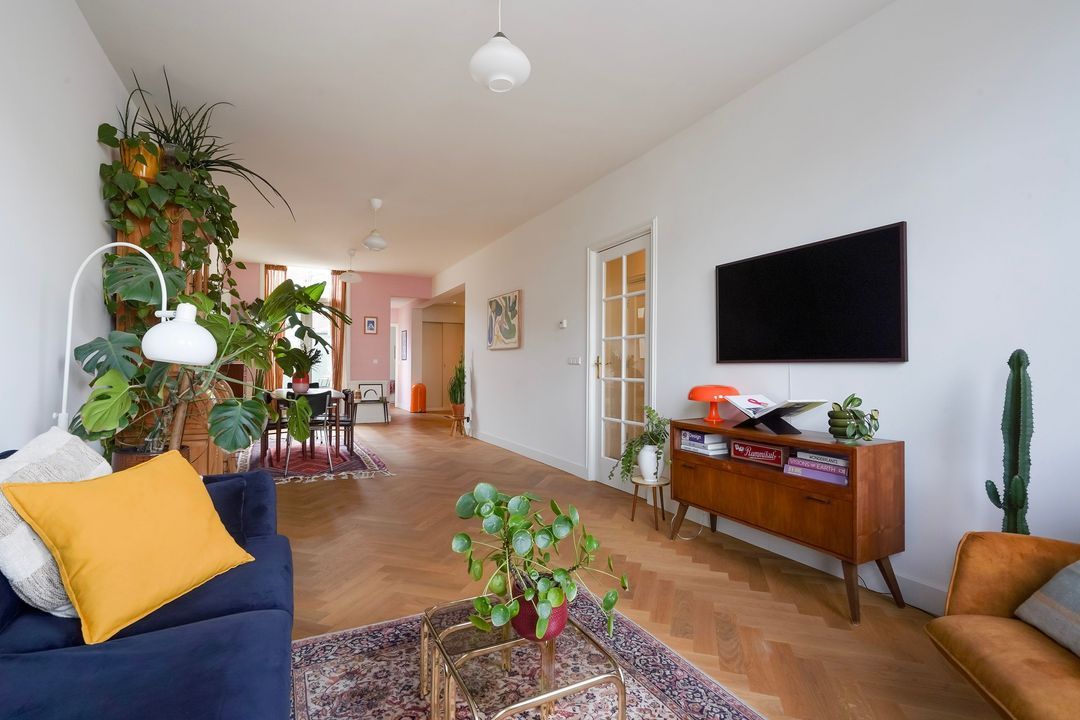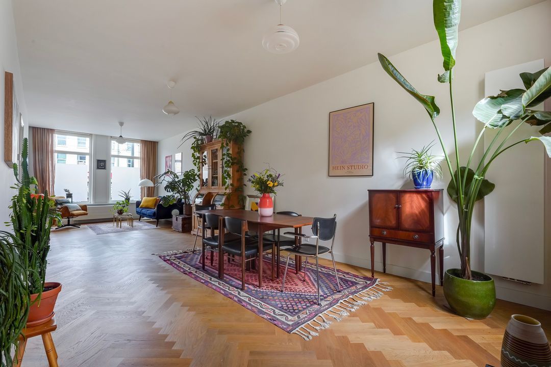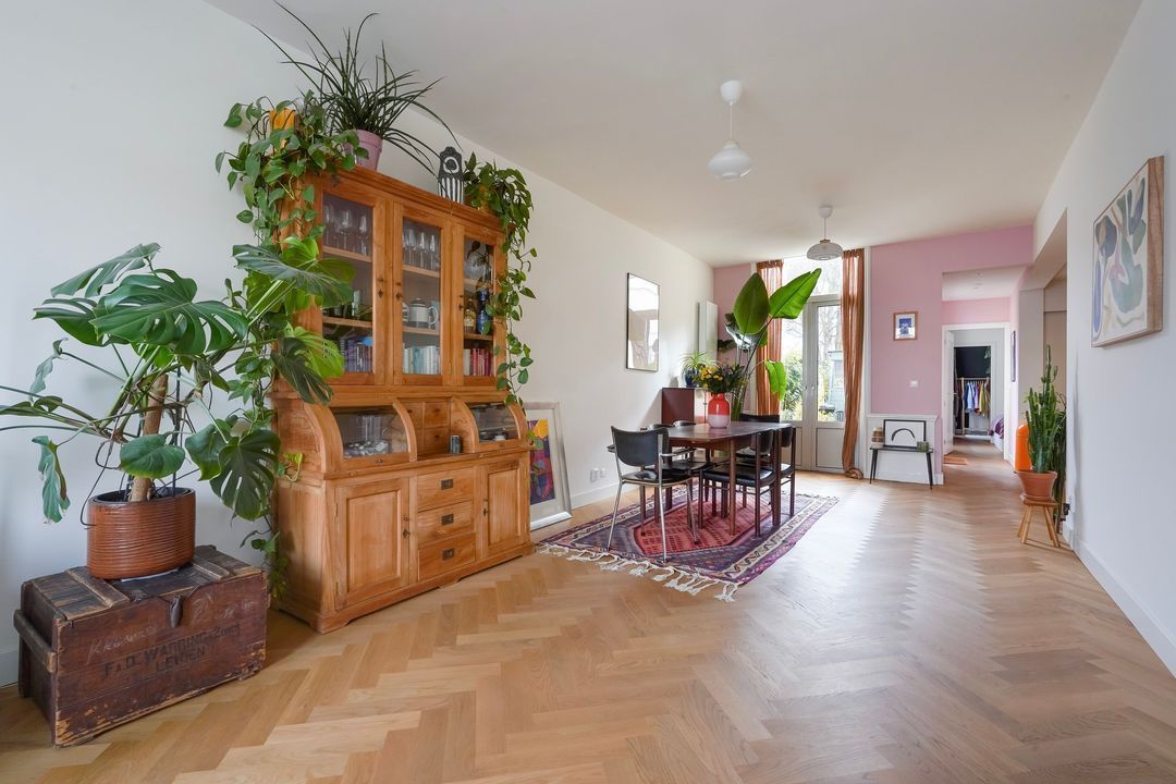 Sfeervolle, lichte en doorgebroken woon/eetkamer voorzien van fraaie eikenhouten parketvloer in visgraatmotief (doorgelegd op de begane grond) en hoge plafonds (ca. 3,11 meter).