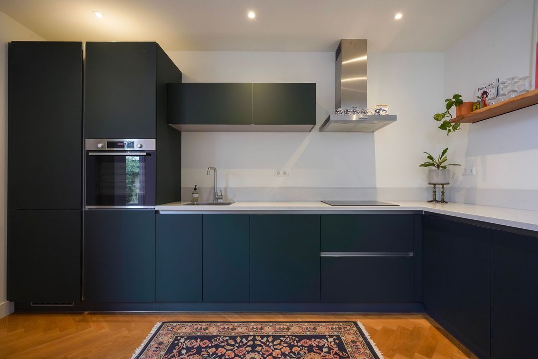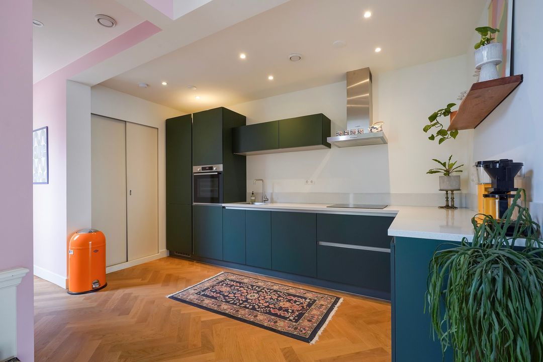 Luxe half open keuken (met fraaie muurdoorbraak) voorzien van een L-vormig composiet aanrechtblad, inductiekookplaat, afzuigkap, koel/vriescombinatie, oven en vaatwasser (allen merk Bosch). Via schuifdeur toegang tot de bijkeuken voorzien van wasmachine-aansluiting en opstelplaats cv-ketel.
