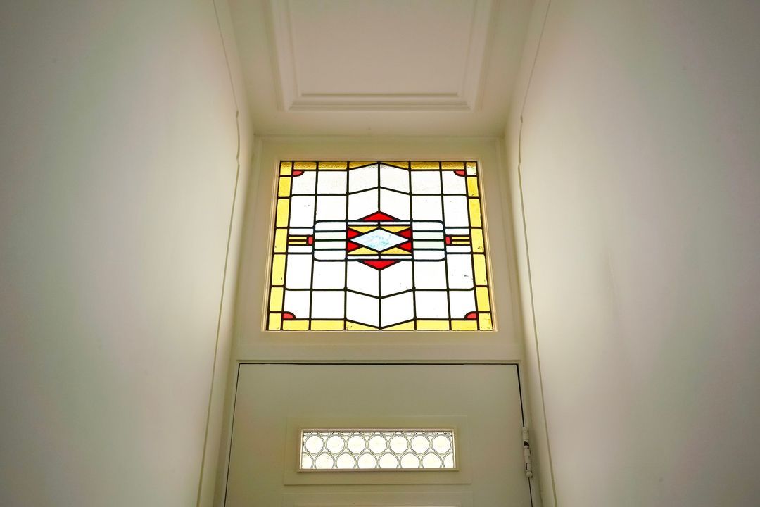 Via a classic front door with a stained-glass transom, apartment entrance, hallway featuring a granite floor extending into the corridor, draft door, separate modern toilet with washbasin.
