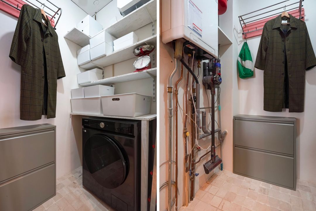Luxurious semi-open kitchen (with an attractive wall opening) equipped with an L-shaped composite countertop, induction hob, extractor hood, fridge-freezer, oven, and dishwasher (all Bosch brand). Access via a sliding door to the utility room, equipped with a washing machine connection and space for the central heating boiler.