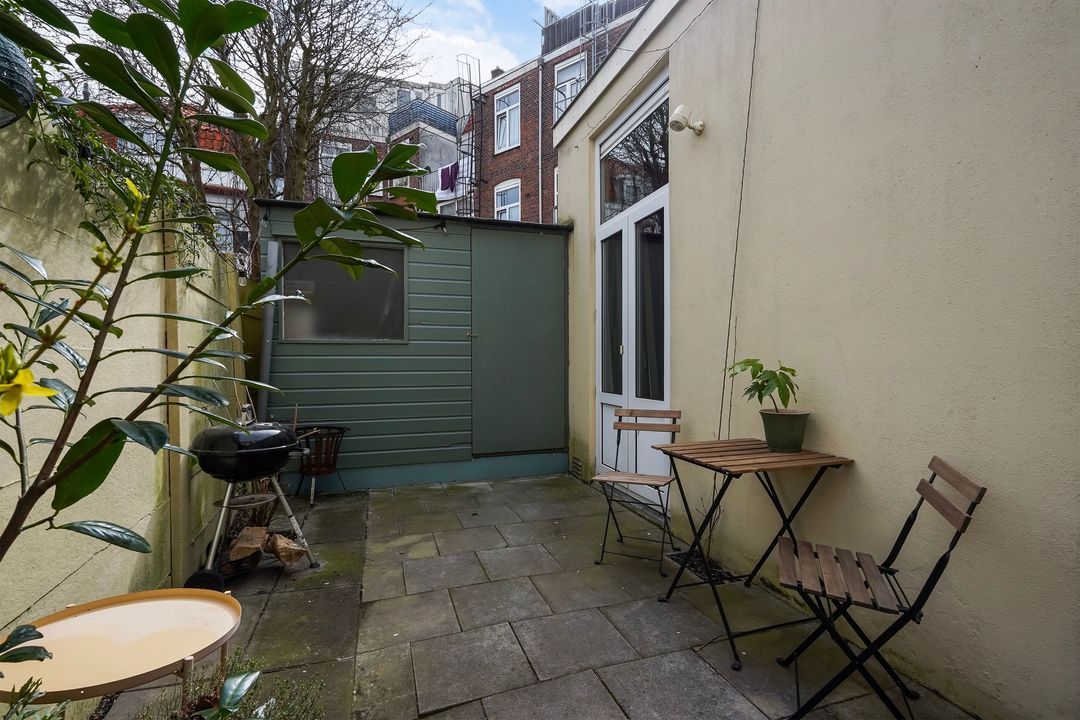 Via openslaande deuren vanuit de woonkamer of enkele deur vanuit de keuken toegang tot de verzorgde stadstuin, gelegen op het zuidoosten met ochtend- en middagzon, voorzien van een riante houten berging.