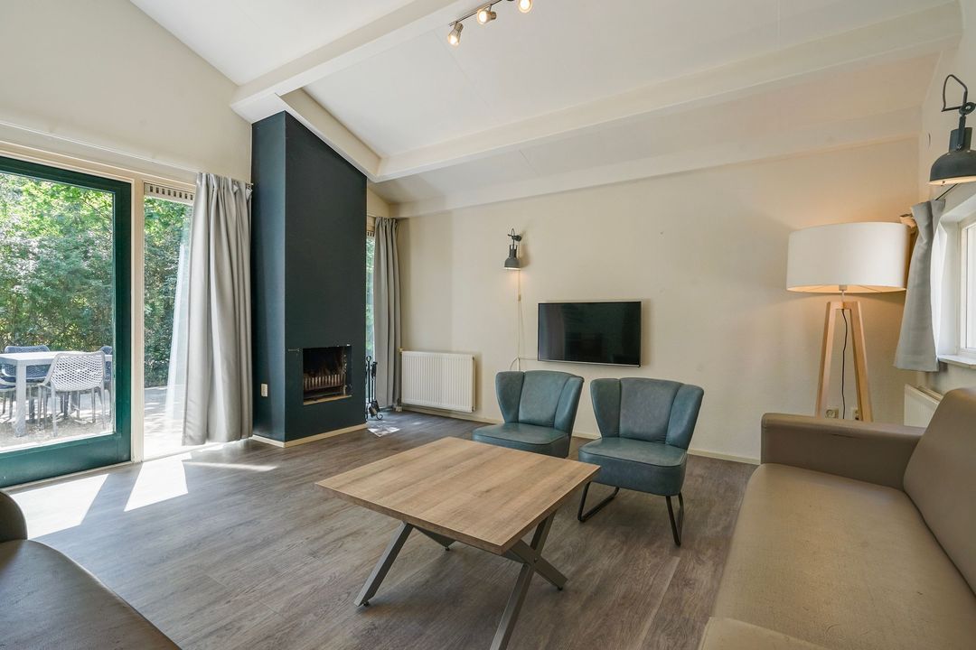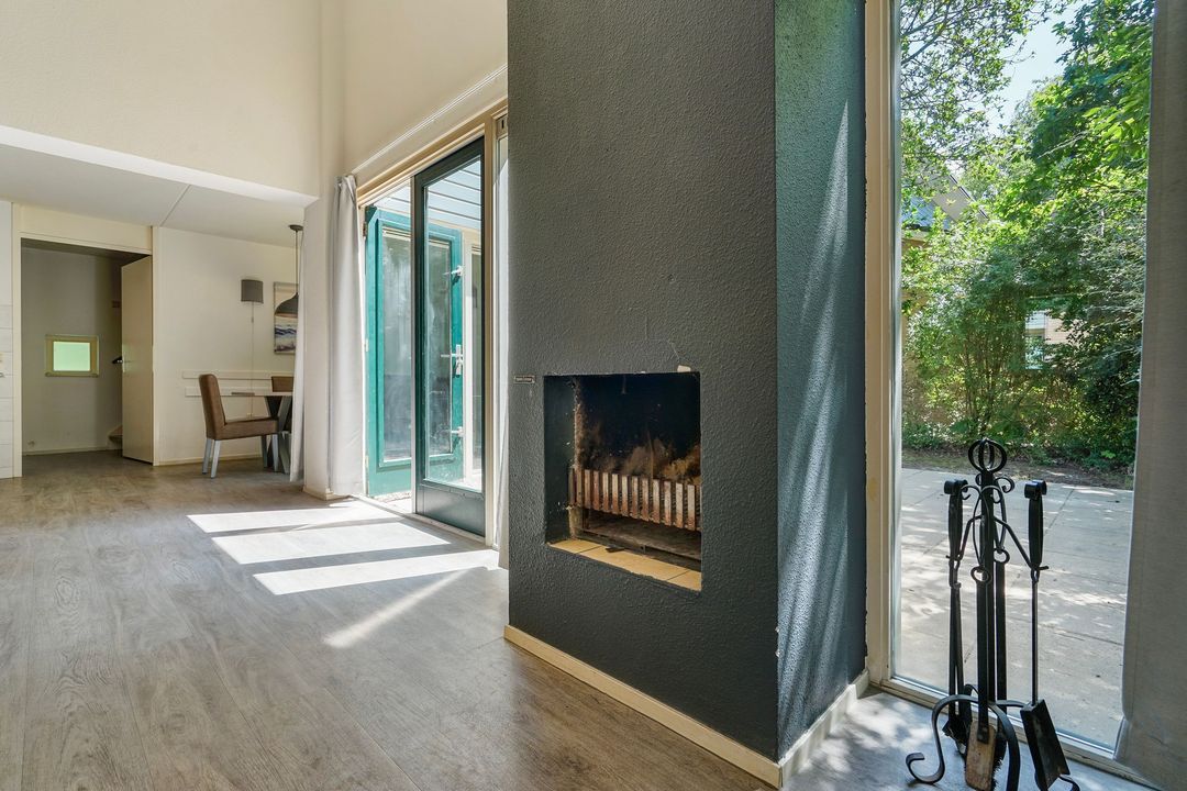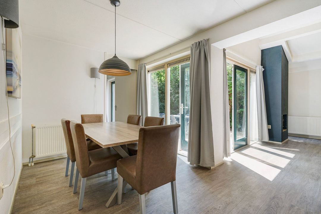 Spacious, bright living/dining room with fireplace and patio doors to the well-kept spacious garden with a sunny terrace with tiles and located on the southwest with sheltered location.