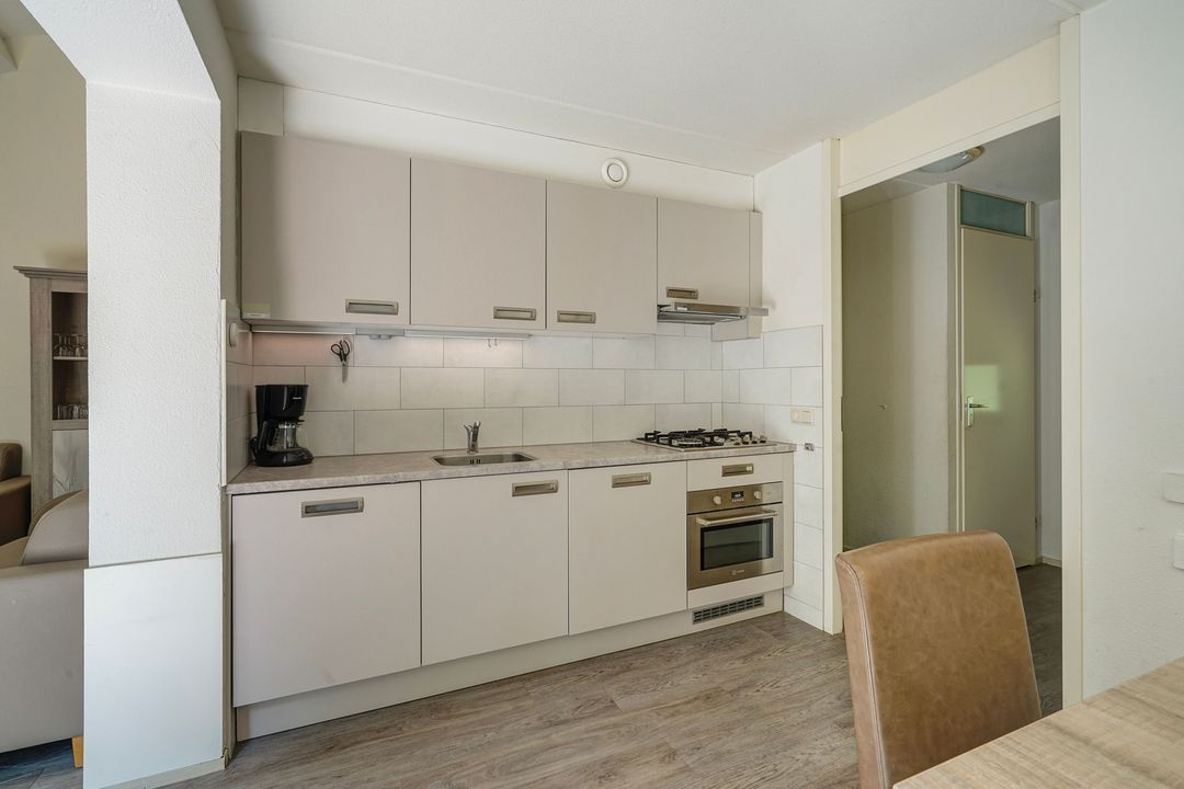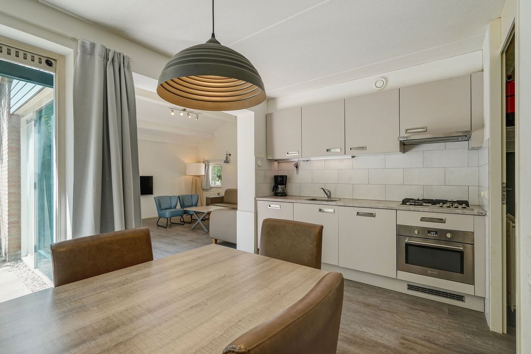Woonkeuken voorzien van 4-pits gasfornuis, afzuigkap, combi magnetron oven, koelkast met vriesvak en vaatwasser.