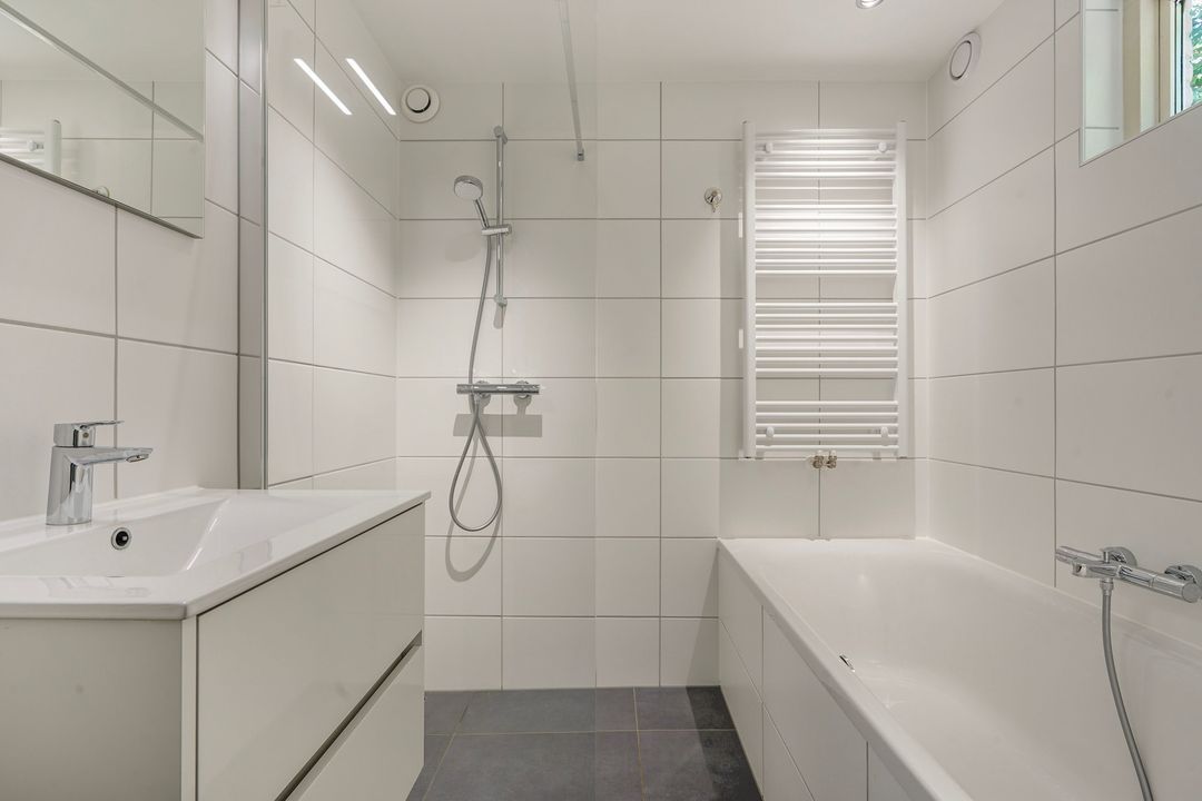 First bedroom with also patio doors to the terrace. Connected, modern fully tiled bathroom with bath, spacious walk-in shower, washbasin and design radiator.