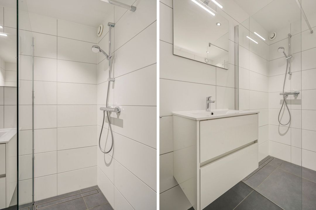 Overloop, sauna en 2e moderne geheel betegelde badkamer voorzien van een inloopdouche, 2e toilet, wastafelmeubel en designradiator. Twee ruime slaapkamers.