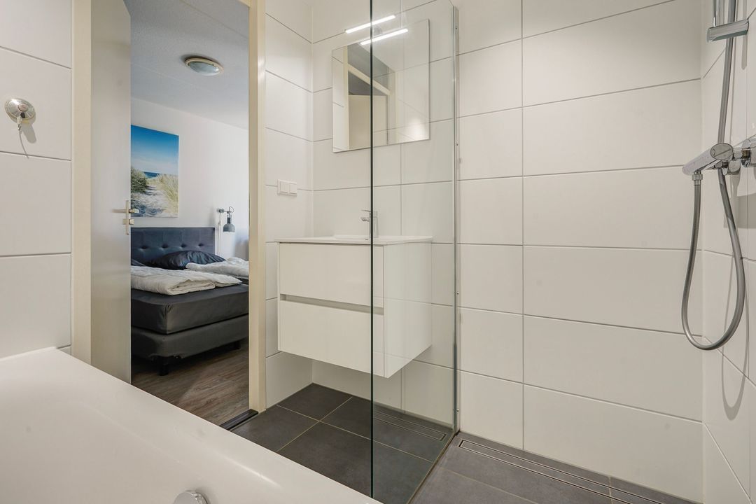 Eerste slaapkamer met eveneens openslaande deuren naar het terras. Aangesloten, moderne geheel betegelde badkamer voorzien van ligbad, ruime inloopdouche, wastafelmeubel en designradiator.