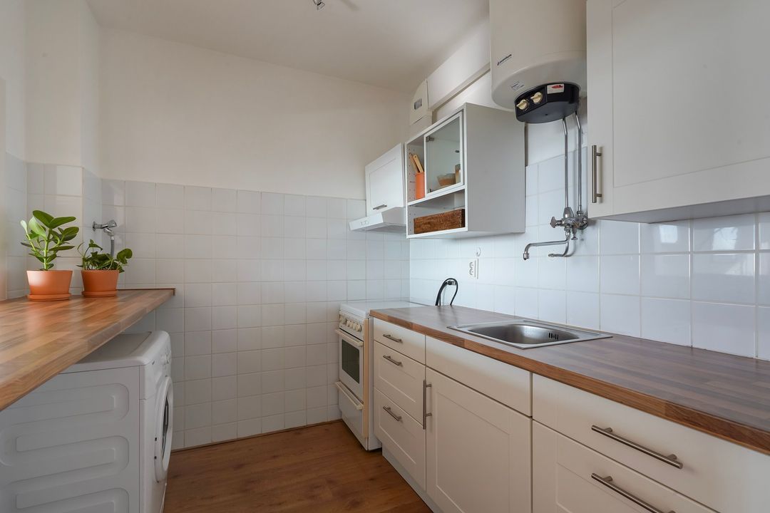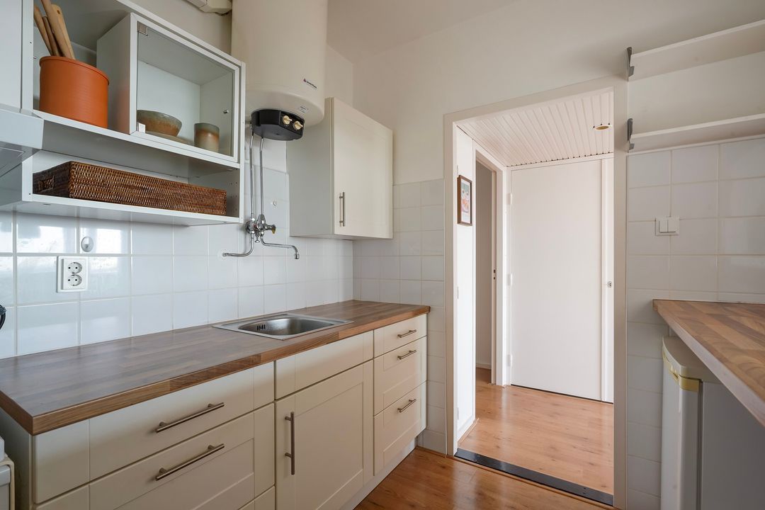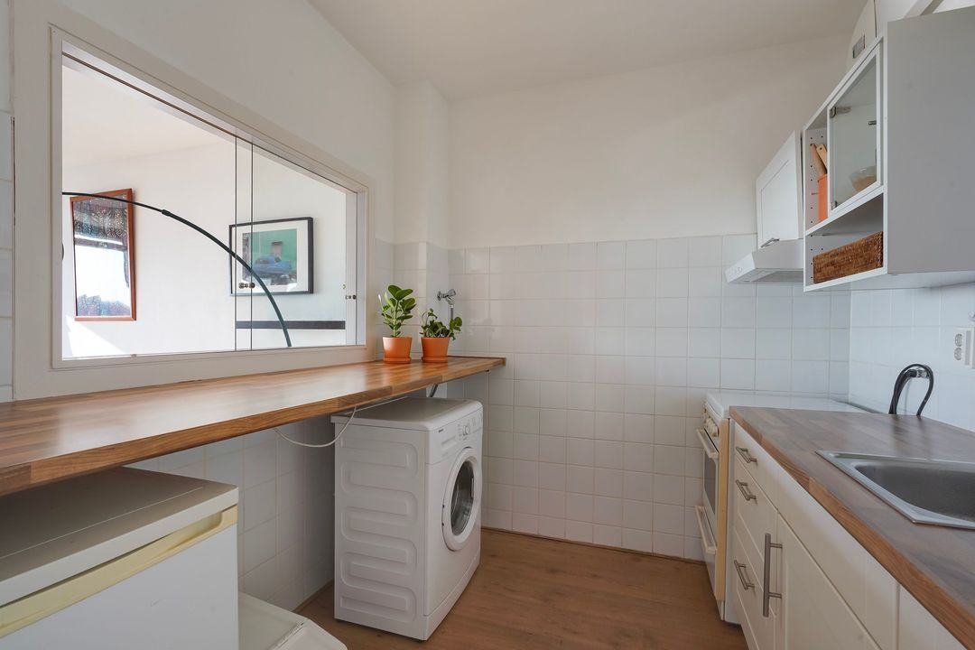Nette keuken voorzien van gasfornuis, koelkast met vriesvak en doorkijk met schuifraam naar de woon-/eetkamer.