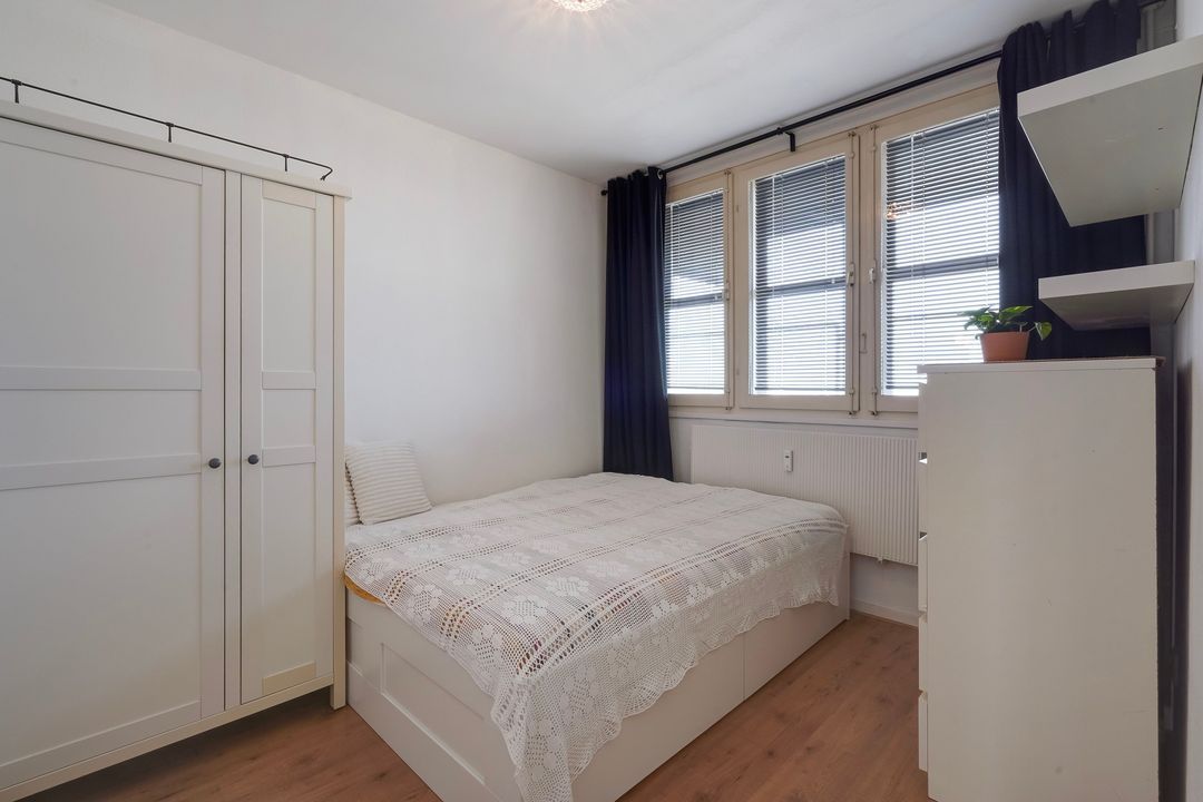Apartment entrance, vestibule with meter cupboard, door to hallway, separate toilet with hand basin, and built-in closet. Spacious bedroom with access to the bathroom with a large walk-in shower and washbasin.