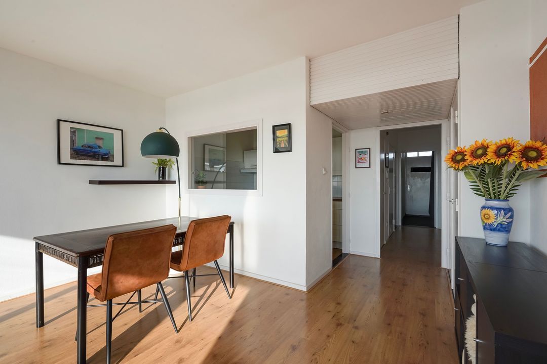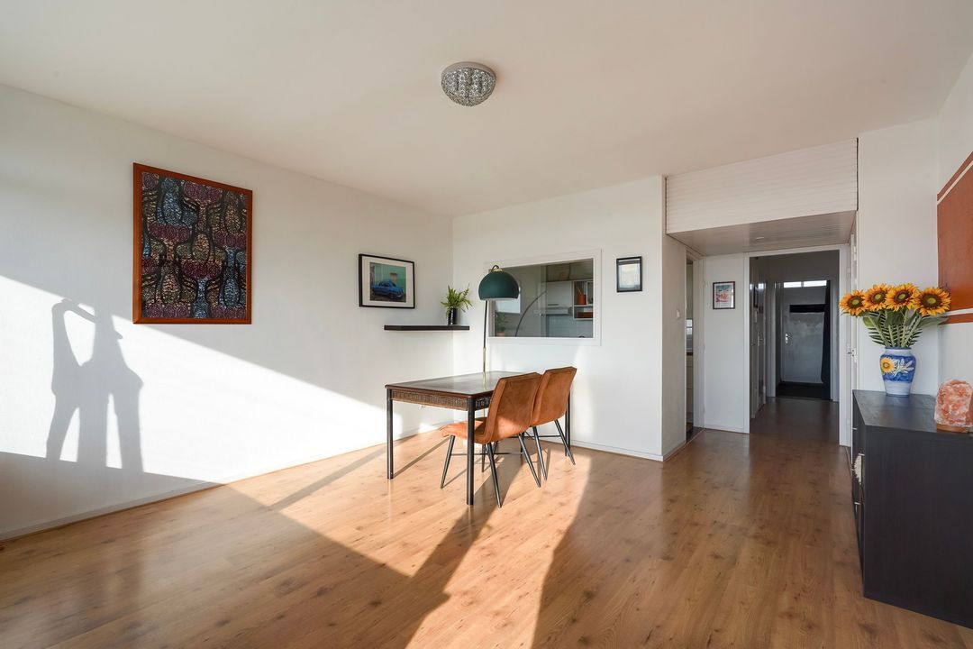 Sfeervolle woon-/eetkamer met deur naar het zonnige balkon (zuidwesten) met een prachtig uitzicht over Hoek van Holland, strand, zee en duinen.