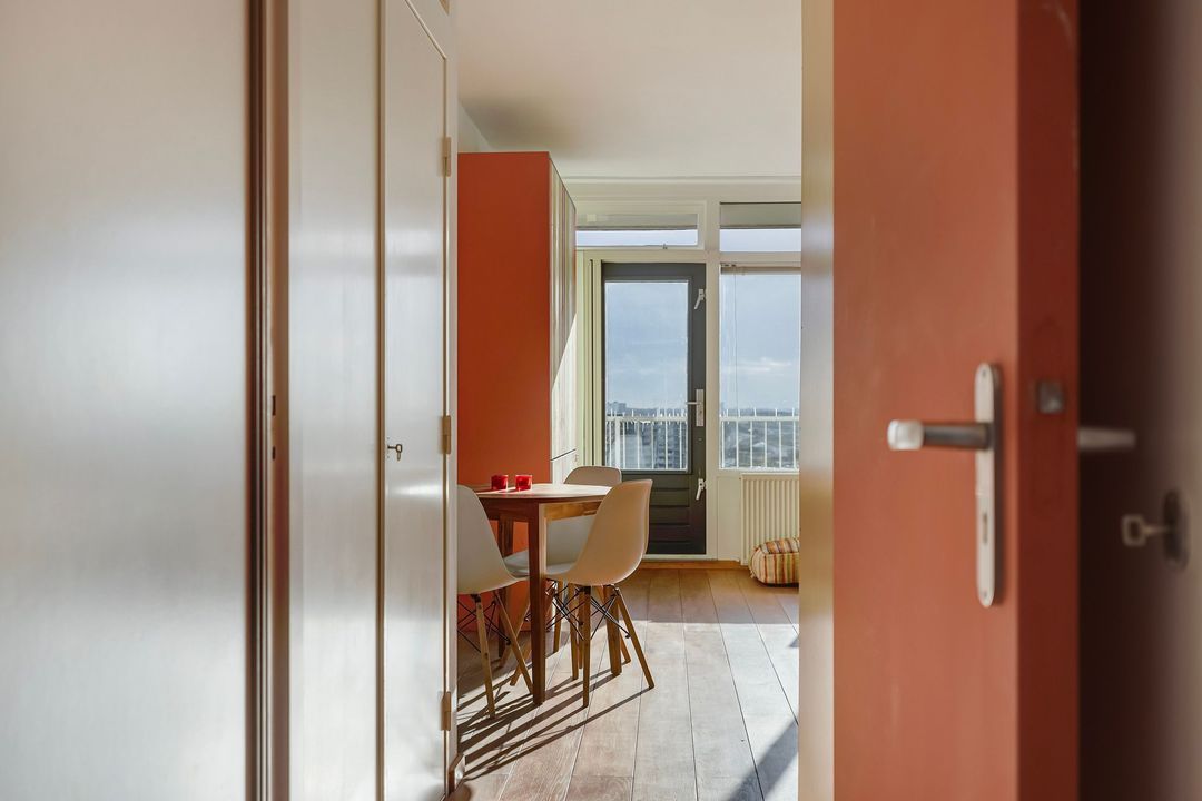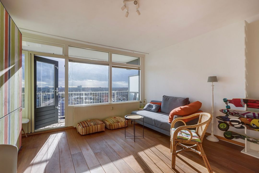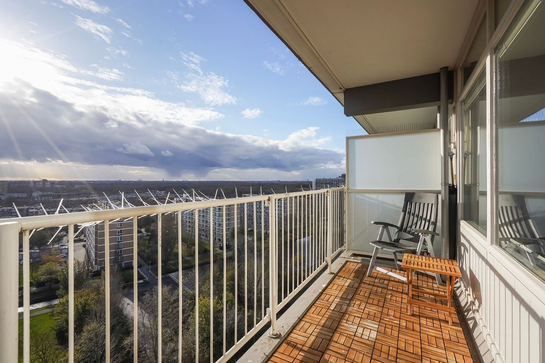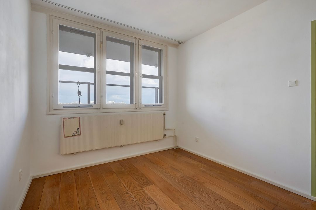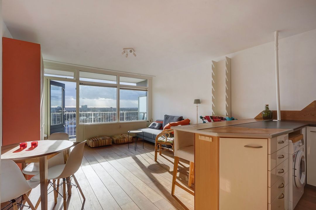 Gelegen op de 12e TOP-verdieping, een licht en zo te betrekken 2-kamer appartement voorzien van een woonkamer met open keuken, aparte slaapkamer, moderne badkamer met WC en ingang via de gang, riant zonnig balkon, gang met zeer veel kastruimte achter een ingebouwde wand met schuifdeuren, en separate (fietsen)berging.