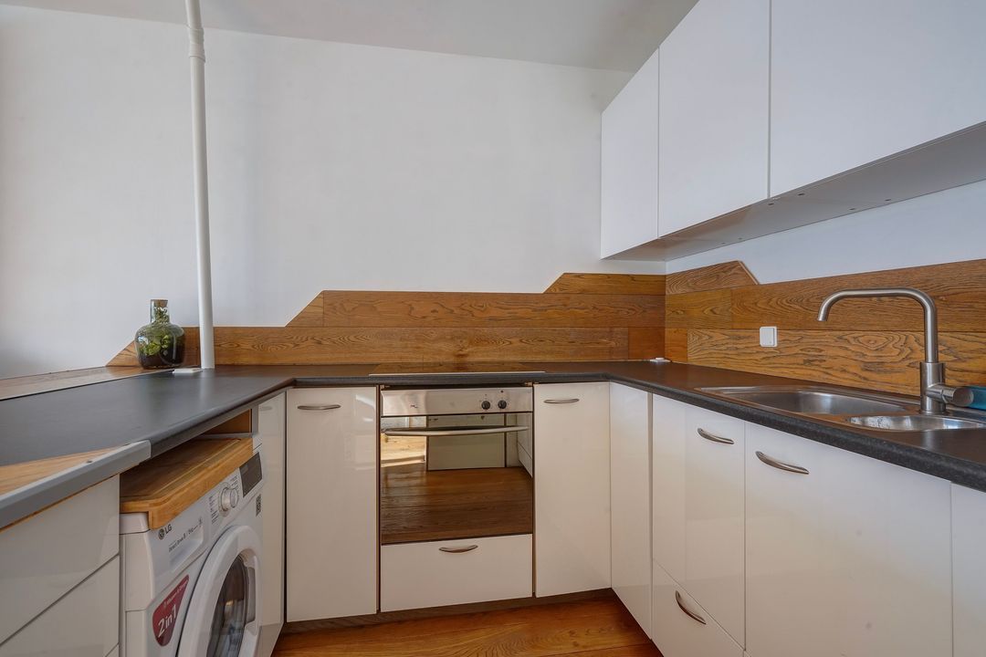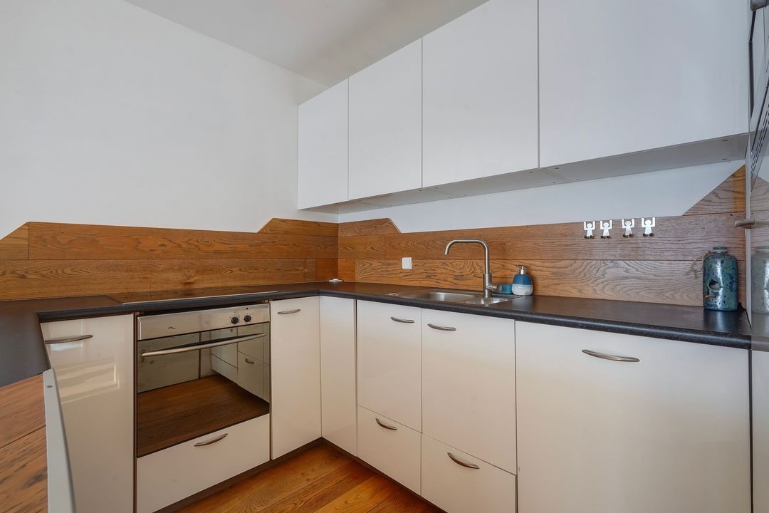 The floors are very thick oak that have never been sanded. This means they will last for hundreds of years! These are old but still perfect floors from a monastery that were given a new life during the renovation of the apartment in the year 2020. To create some contrast, the floors in the bedroom and kitchen area are finished with a bit lighter finishing. If the same color as the rest of the floors is desired, they can be finished with a darker lacquer.