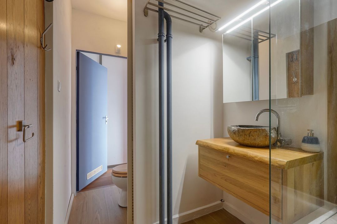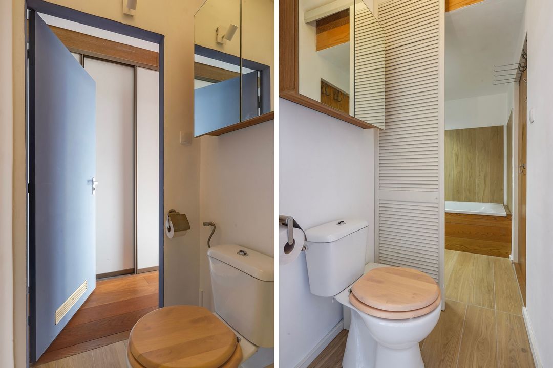 In tegenstelling tot de andere appartementen in dit complex betreft het hier een gecombineerde toilet/badkamercombinatie met scheidingsdeur tussen toilet en badkamer en ingang vanuit de gang zodat wc en badkamer tegelijkertijd en toch apart gebruikt kunnen worden, en men niet door de slaapkamer moet om in de badkamer te komen. Indien gewenst kan de oorspronkelijke directe doorgang tussen slaapkamer en badkamer echter weer in ere hersteld worden.