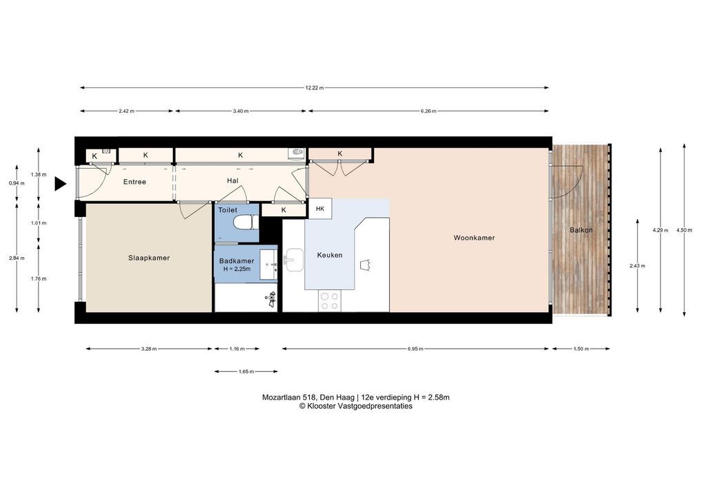 Woonoppervlakte ca. 52 m². De inhoud van het appartement is ca. 165 m³. Door de praktische indeling die ontstaan is door de renovatie, lijkt het een stuk groter, en door het Murphy bed ontstaan twee aparte (slaap)vertrekken. Hierdoor is het appartement niet alleen geschikt voor singles en koppels, maar ook voor kleine gezinnen, of voor mensen die regelmatig logees over de vloer hebben.