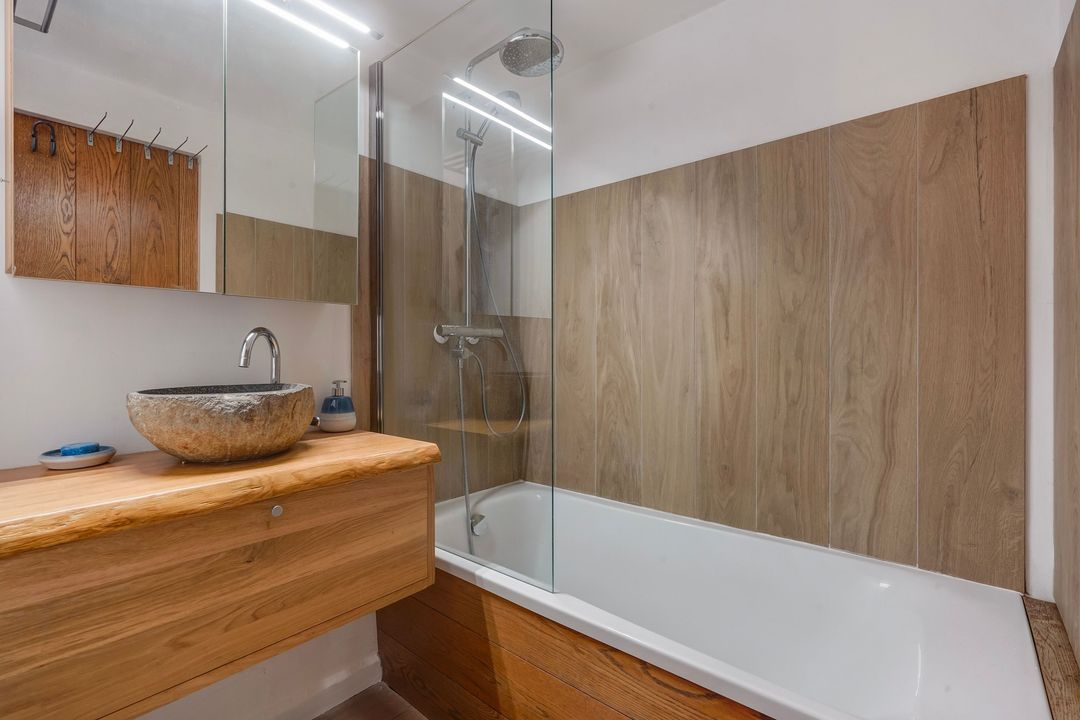 From the hallway access to the modern, beautifully tiled bathroom (combined toilet/bathroom) equipped with a toilet, bathtub with shower, vanity unit and two mirrored cabinets. A sliding door allows one to separate the WC area and bathroom area so that both can be used simultaneously.