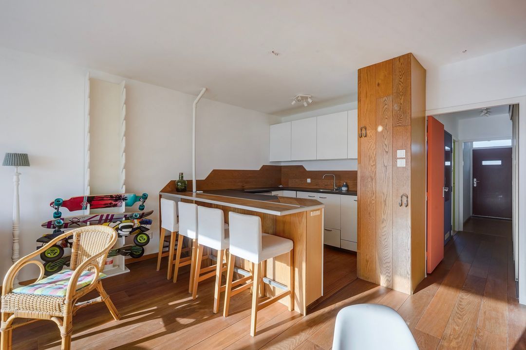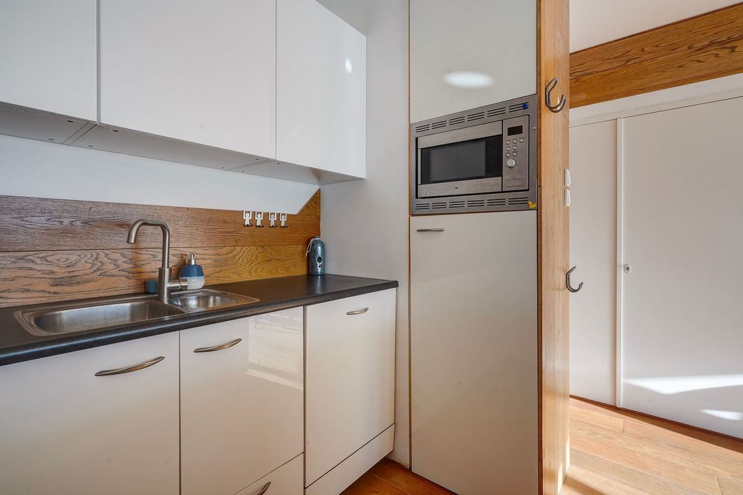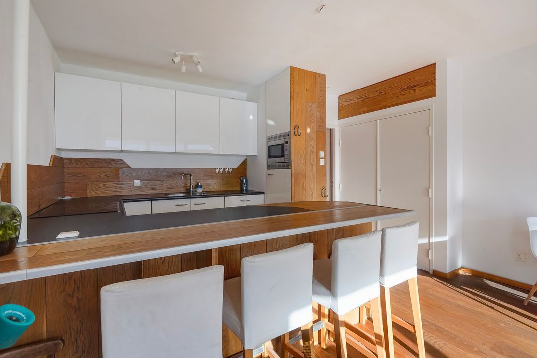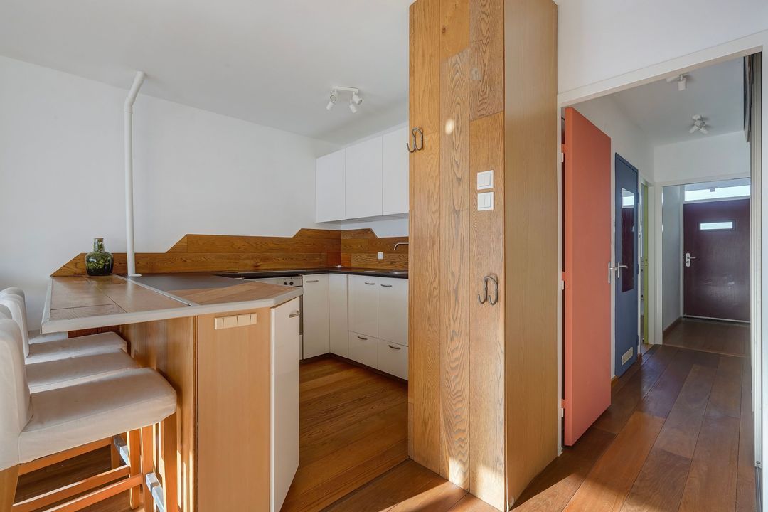 In tegenstelling tot vele appartementen in dit complex, is de keuken opengebroken om een woonkamer met open keuken te creëren, maar zijn de dubbele vaste kasten wel behouden en is extra kastruimte boven de dubbele vaste kasten gecreëerd (achter de eikenhouten kanteldeur).