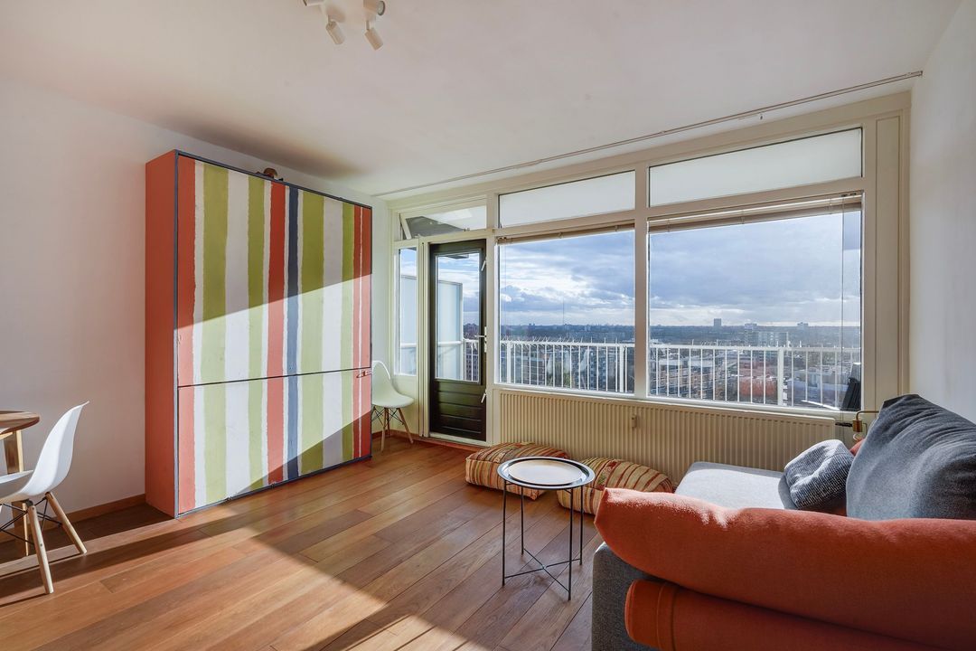 The double Murphy bed (hidden in the paintable red/blue/green/white "cabinet" in the living room) can be taken over to expand the apartment with an additional bedroom with spectacular views (the lights of the Nieuwe Waterweg). If desired, all furniture (including the high-quality sofa) in the apartment could stay in the apartment, so you can move into the apartment right away without having to move or buy furniture!