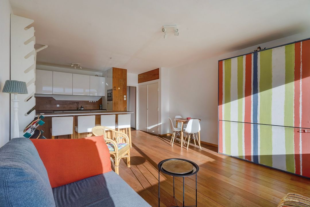 The living area is approximately 52 m². The apartment has a volume of approximately 165 m³. The practical layout created by the renovation makes it appear much larger, and the Murphy bed creates two separate (sleeping) areas. This makes the apartment suitable not only for singles and couples, but also for small families or those who regularly host guests.