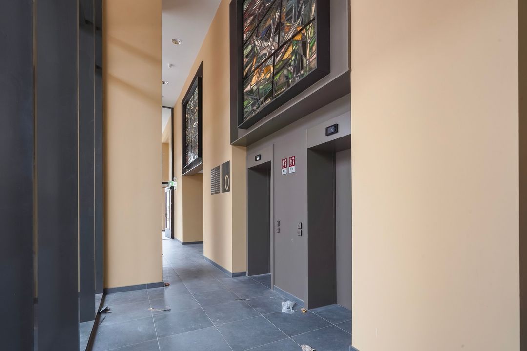 Through a beautiful hallway with elevator or stairs to the 4th floor. Entrance hall, meter cupboard, separate toilet with hand basin, and an indoor storage room with a washing machine connection.