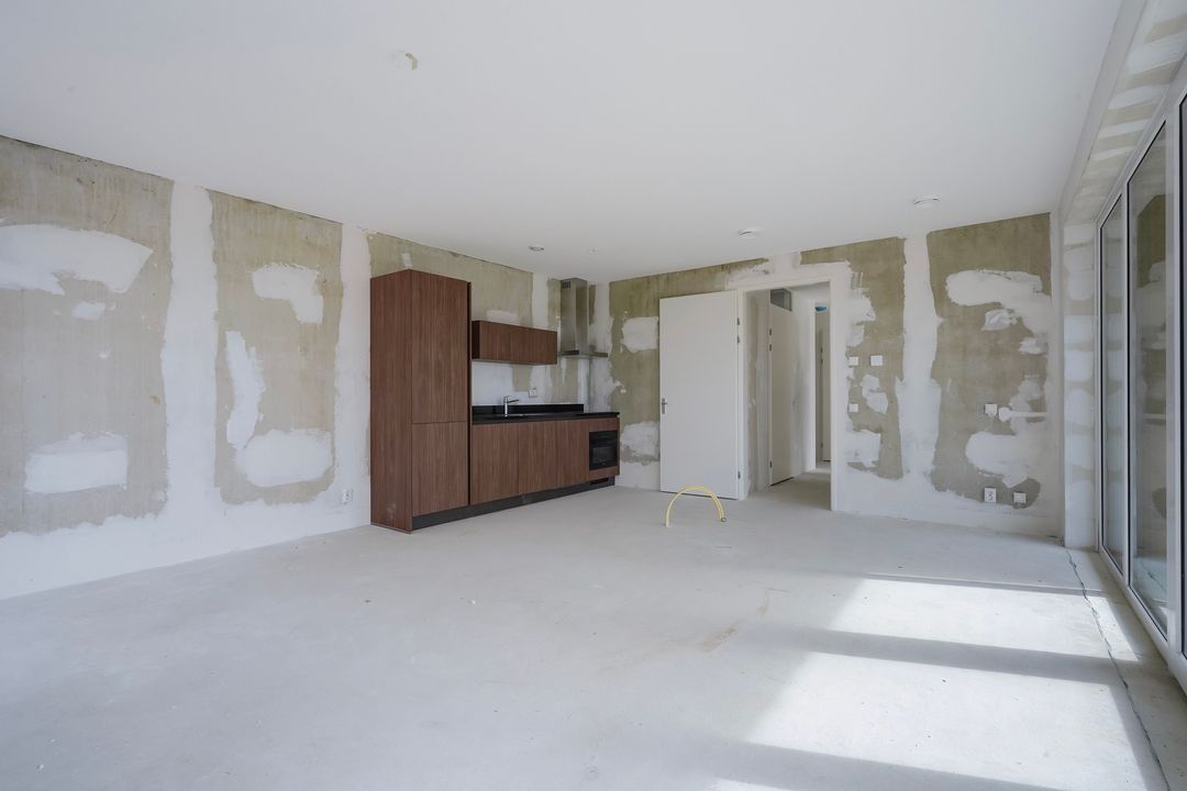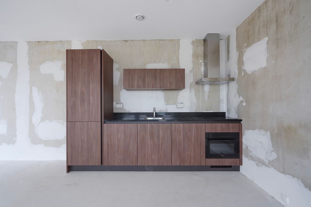 Lichte woonkamer met open keuken voorzien van diverse inbouwapparatuur, zoals inductie kookplaat, oven, afzuigkap, vaatwasser en koel/vriescombinatie.