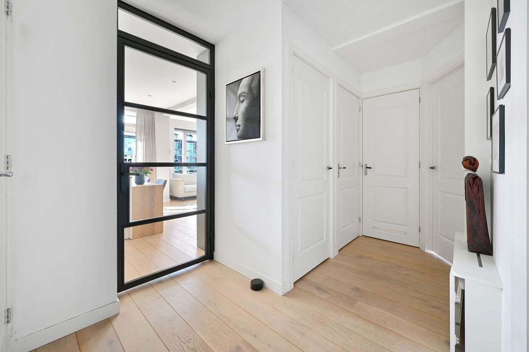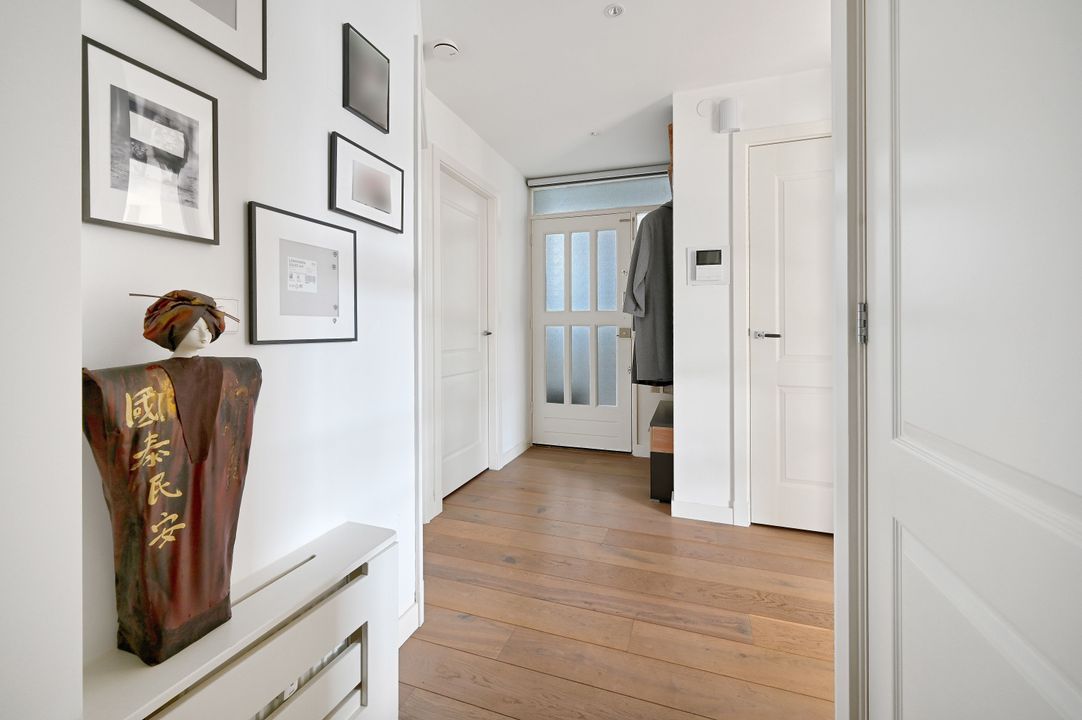 Ruime centrale hal met toegang tot alle vertrekken voorzien van een eikenhouten vloer geheel doorgelegd in de woning, meterkast, vaste kast met aansluitingen voor wasmachine- en droger en separaat modern toilet met fontein.