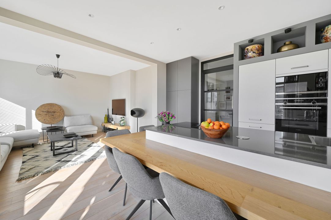 A black door leads to the inviting, bright, and open-plan living/dining room with a kitchen/diner featuring an island with a Quooker, Bora induction cooking top, various built-in appliances including a dishwasher, a 3-drawer fridge/freezer, an oven, a microwave and ample storage space, including a custom-made cabinet. The island features a custom-made wooden countertop that serves as a dining area.