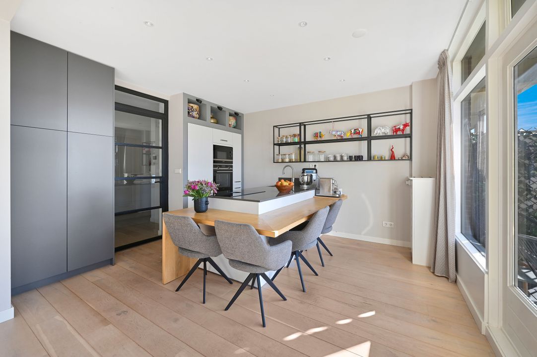 Via zwarte deur toegang tot de sfeervolle, lichte en doorgebroken woon/eetkamer met woonkeuken voorzien van een eiland met Quooker, Bora inductiekookplaat, diverse inbouwapparatuur als een vaatwasser, koel/vriescombinatie (3-laden), oven, magnetron en veel opbergruimte waaronder een op maat gemaakte kast. Het eiland is voorzien van een op maat gemaakt houten blad wat gebruikt wordt als eetgedeelte.