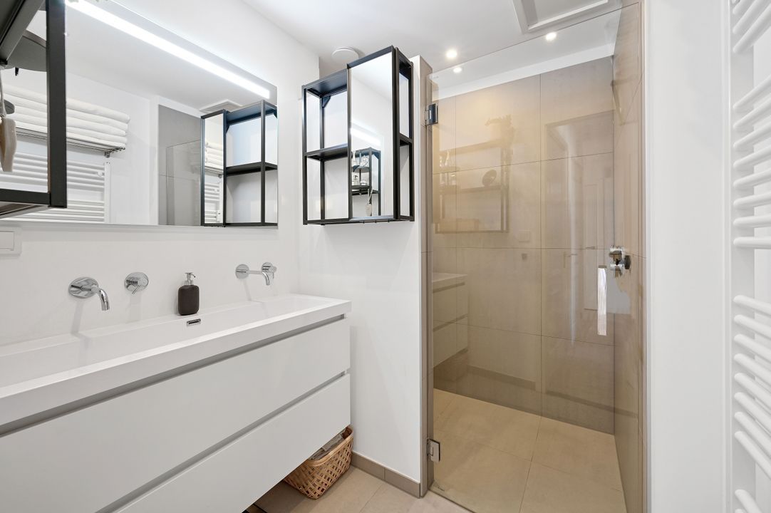 Luxurious bathroom with a spacious walk-in shower, double washbasin with built-in taps and a design radiator.