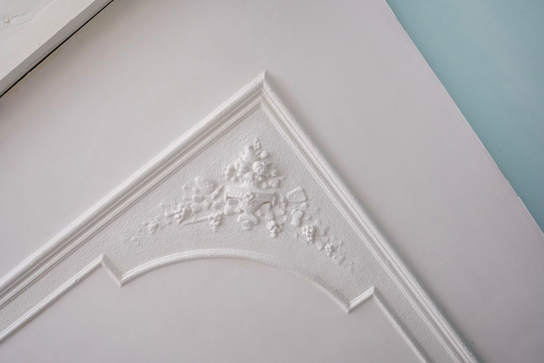 A stained-glass door leads to the rear extension, which houses a spacious master bedroom with two built-in wardrobes. This room features beautiful original moldings on the walls and ceiling and double doors provide access to the back garden.