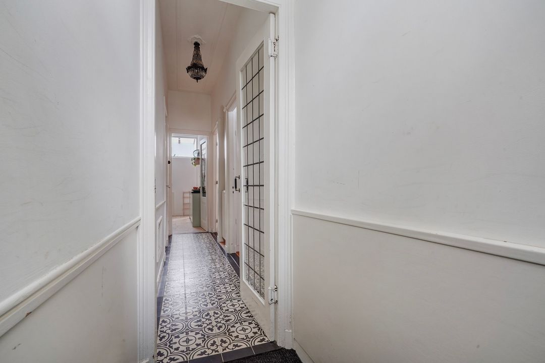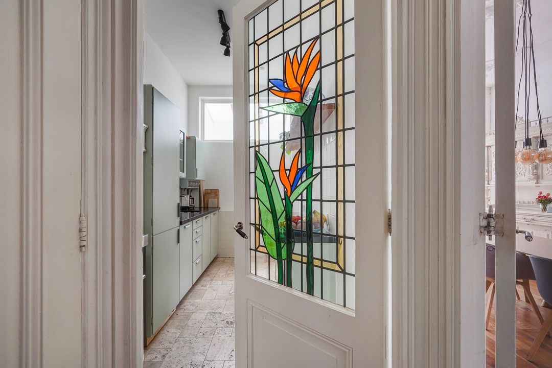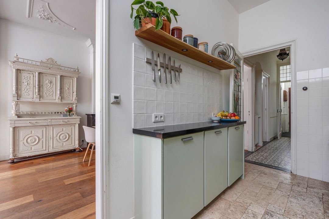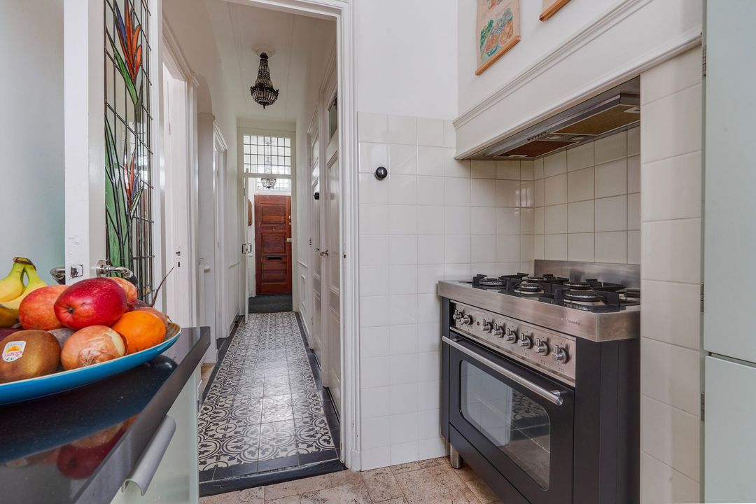 Entree, vestibule, tochtdeur, gang met fraaie vloertegels, trappenkast en toilet met fontein. Toegang naar de woon/eetkamer met authentieke glas in lood schuifseparatie voorzien van 4 vaste kasten en veel lichtinval door de grote raampartijen. De twee originele zwarte schouwen en hoge ornamenten plafonds geven deze woning veel authentieke charme.