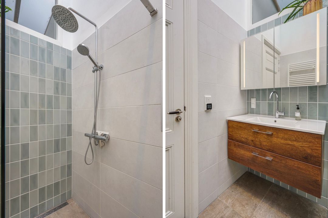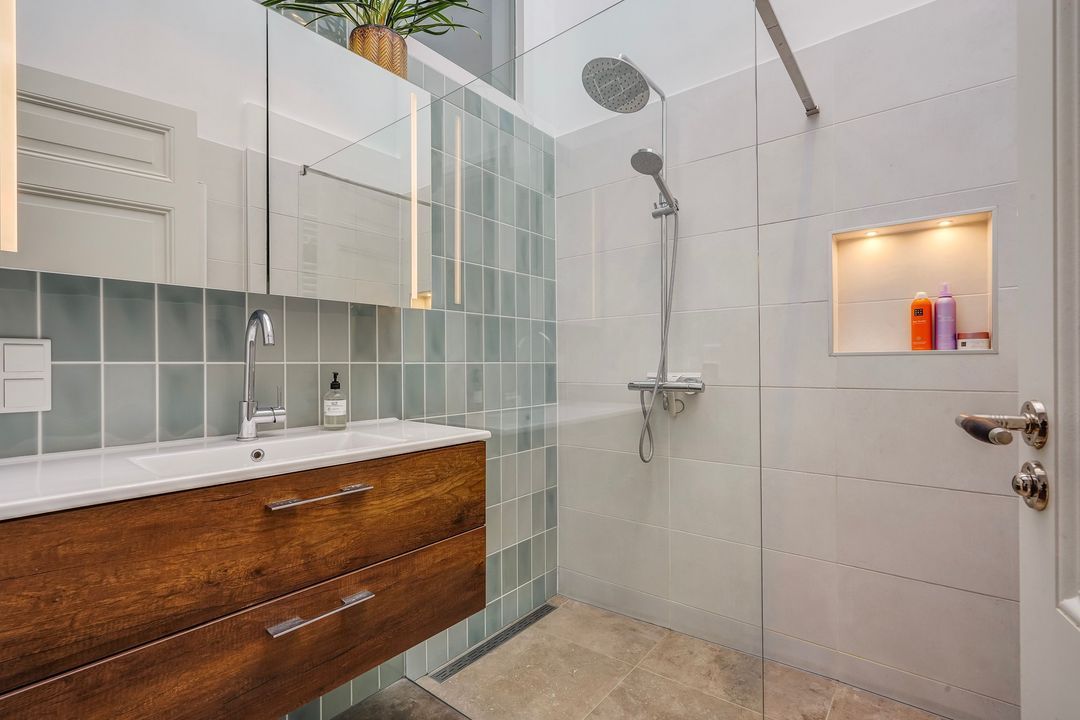 Moderne badkamer voorzien van inloopdouche, fraai wastafelmeubel, vloerverwarming en te openen dakraam.