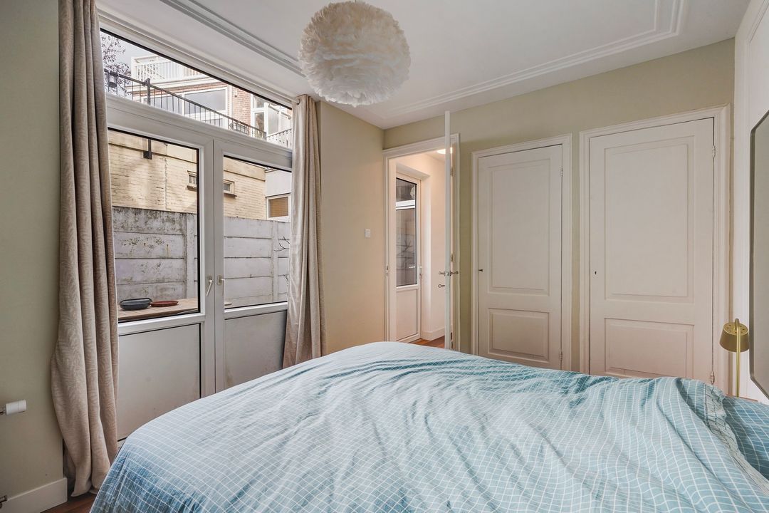 Via glas-in-lood deur naar achterbouw met een ruime hoofdslaapkamer voorzien van 2 vaste kasten. Deze kamer heeft fraai origineel lijstwerk op muur en plafond en via dubbele deuren toegang naar achtertuin.