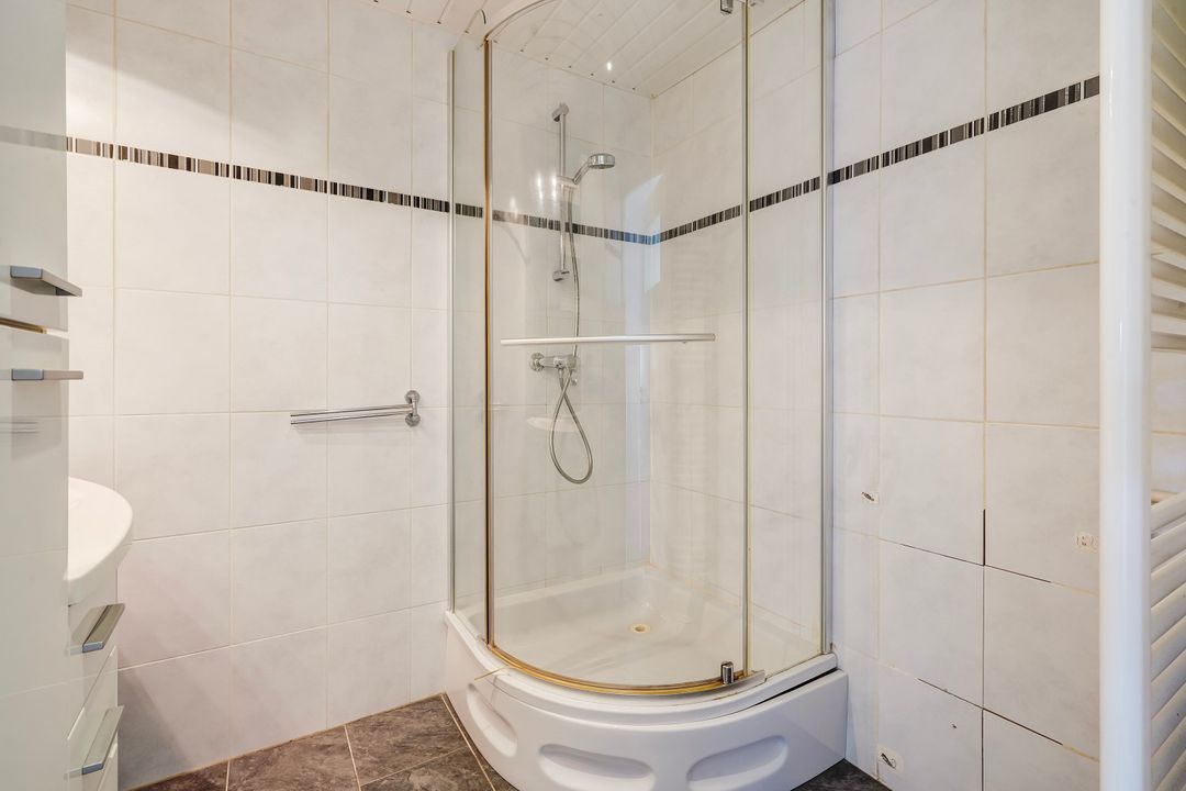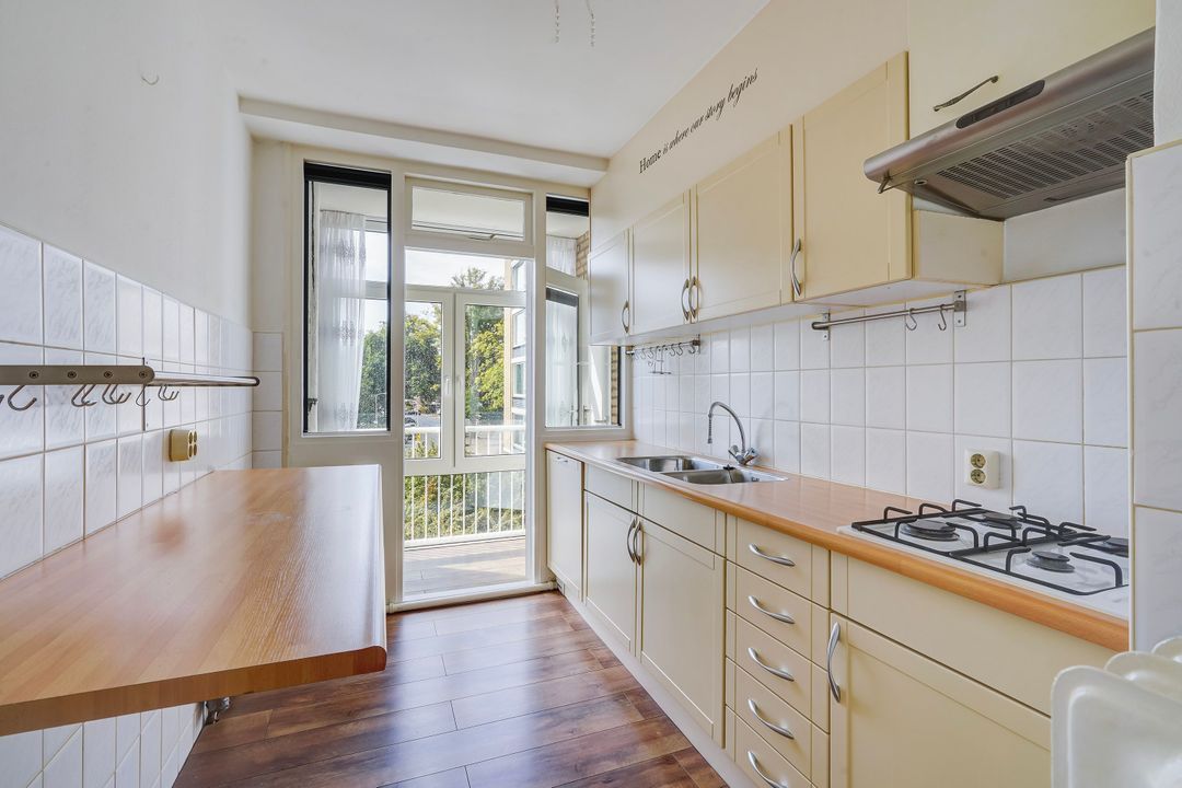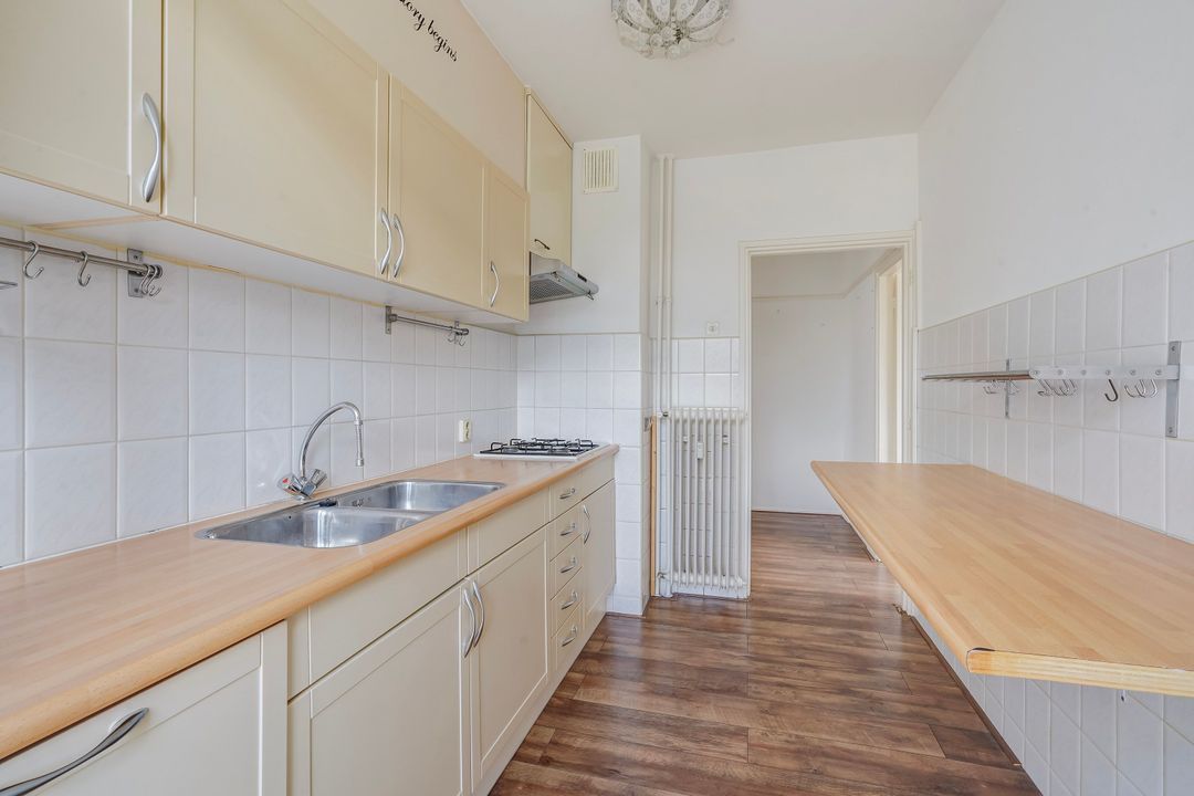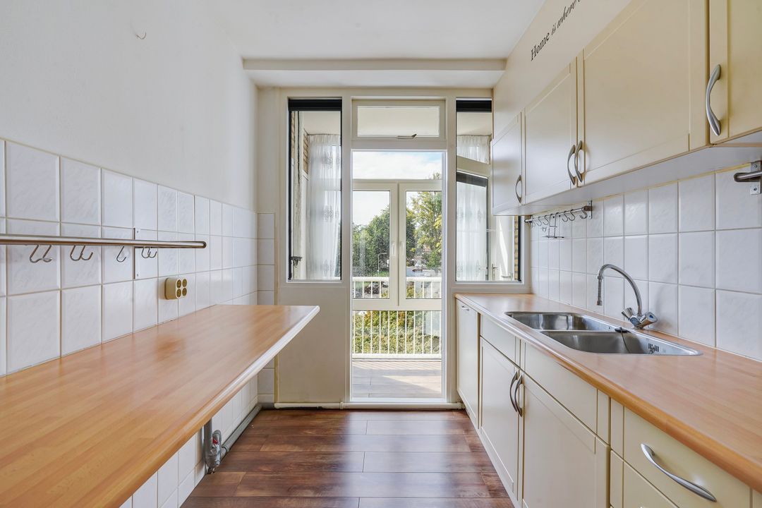 Dichte keuken voorzien van 2 spoelbakken, 4-pits gasfornuis, afzuigkap, vaatwasser en bijgetrokken balkon met 2 vaste kasten, waarvan 1 met opstelplaats voor de geiser.