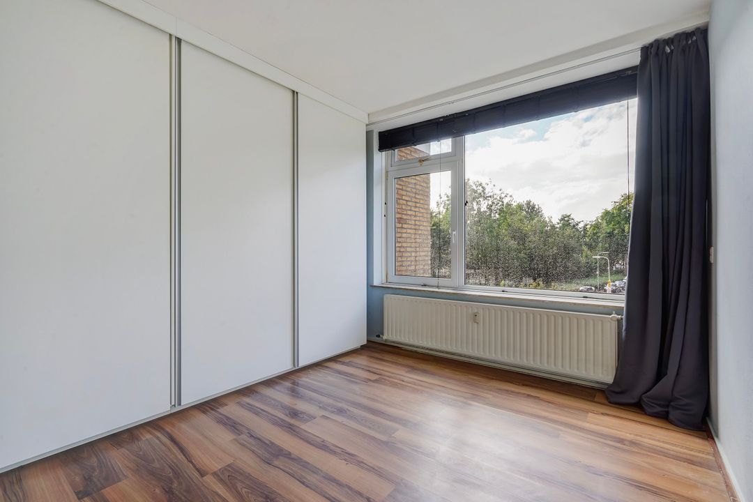 Ruime slaapkamer met kastenwand en groot zijraam.