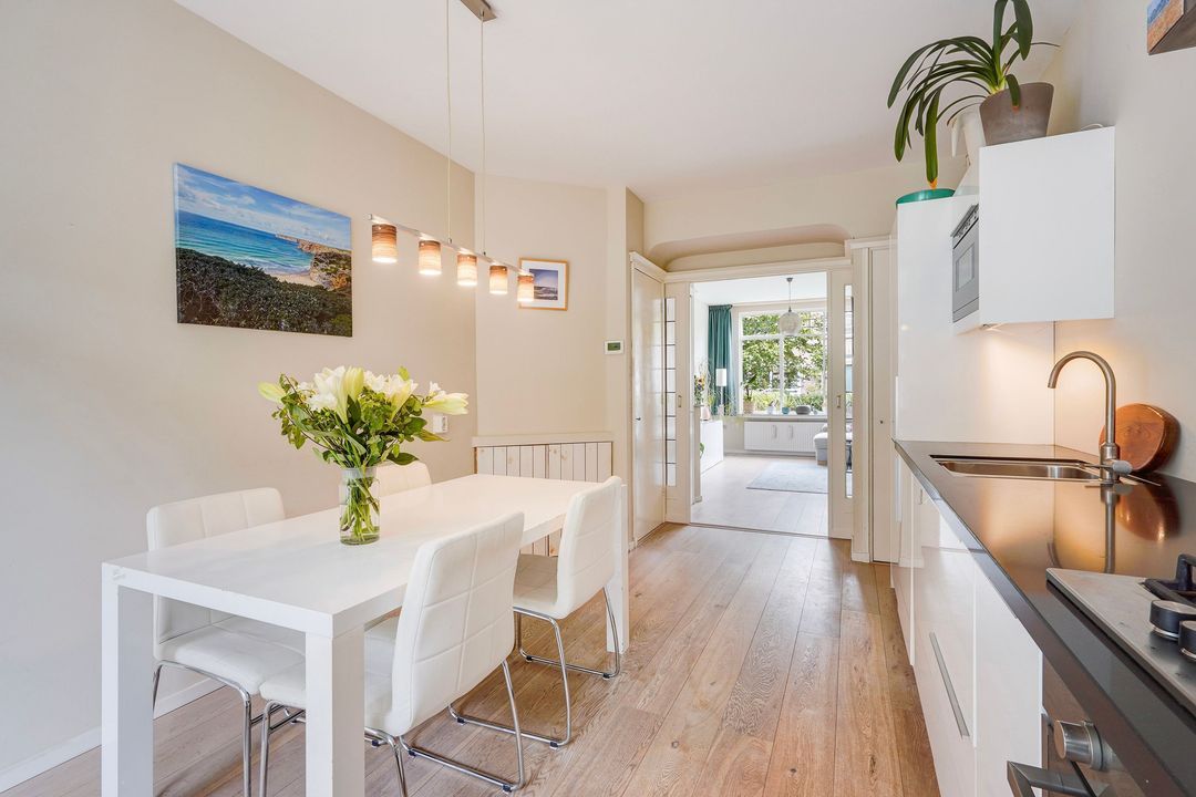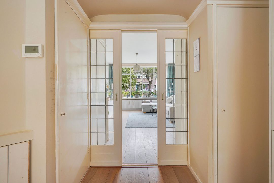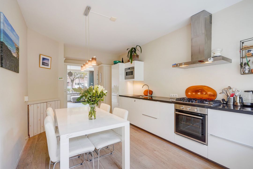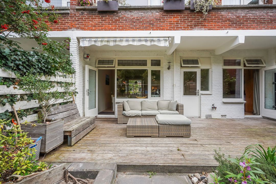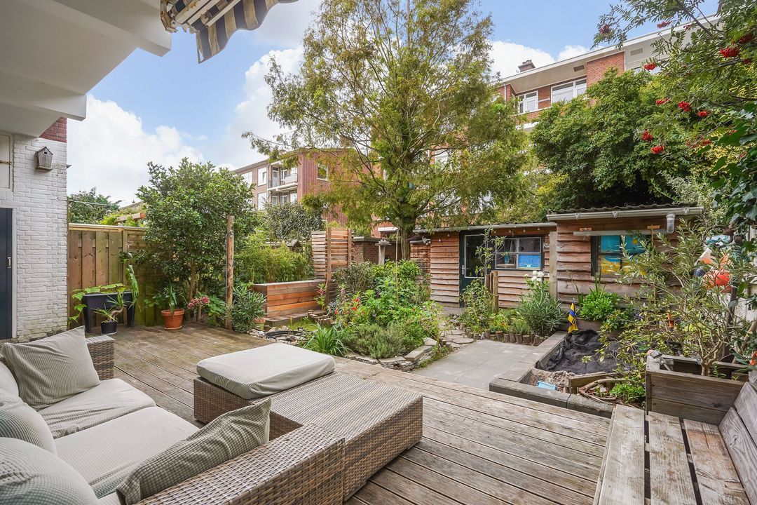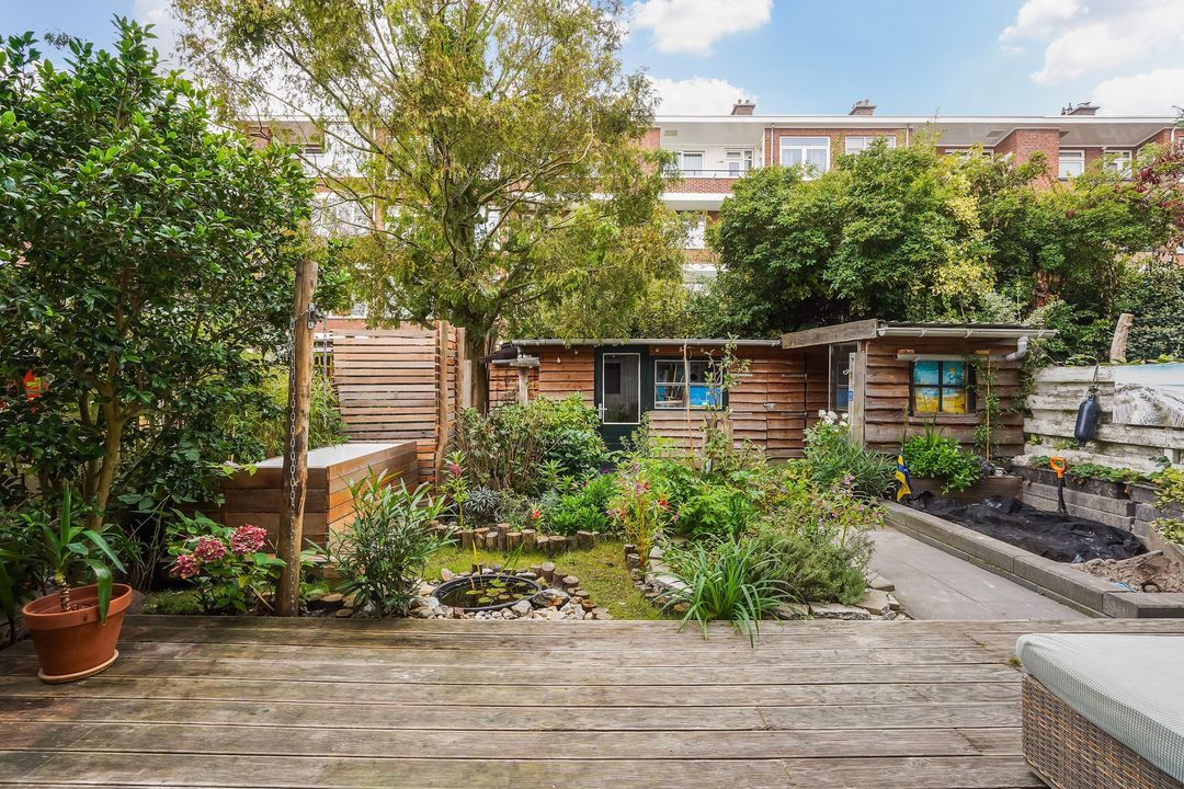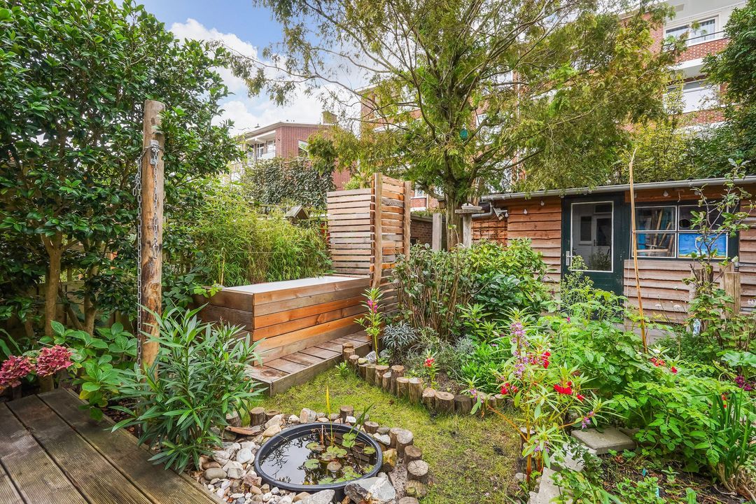 Verzorgd, gesloten portiek met de entree op de begane grond, U-vormige gang, modern toilet met fontein, deels met mozaïek betegelde badkamer met ligbad/douche combinatie en wastafelmeubel, lichte kamer ensuite met schuifseperatie voorzien van glas in lood en 4 vaste kasten, schouw met houtkachel en keukenblok voorzien van natuurstenen aanrechtblad, 5 pits gasfornuis, oven vaatwasser magnetron en koel/vrieskast, ruime voorslaapkamer, achterslaapkamertje waar vroeger de keuken was, 2e achterslaapkamer met kastenwand. Alle vertrekken aan de achterzijde hebben toegang naar een fraai aangelegde zonnige achtertuin gelegen op het zuidwesten voorzien van vaste kast, houten berging met elektra, bevlonderd terras en achterom.