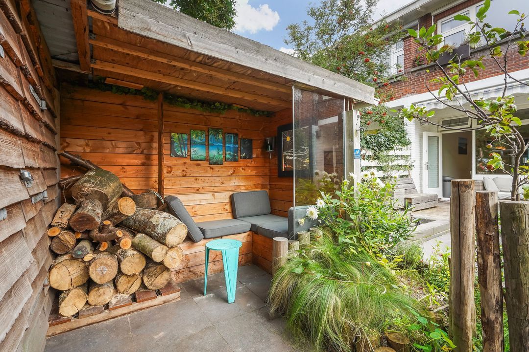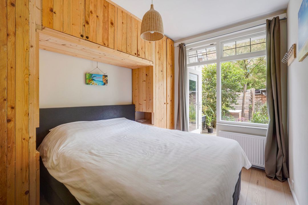Well-maintained, closed-off porch with the entrance on the ground floor, a U-shaped hallway, a modern toilet with a hand basin, a partially mosaic-tiled bathroom with a bath/shower combination and vanity, a bright ensuite room with sliding doors featuring stained glass and 4 built-in wardrobes, a fireplace with a wood-burning stove, and a kitchen unit with natural stone countertop, a 5-burner gas stove, an oven, a dishwasher, a microwave, and a refrigerator/freezer. There is a spacious front bedroom, a smaller back bedroom where the kitchen used to be, and a second back bedroom with a built-in cupboard. All rear rooms open onto a beautifully landscaped, sunny southwest-facing back garden with a fixed cupboard, a wooden shed with electricity, a decking terrace and rear access.