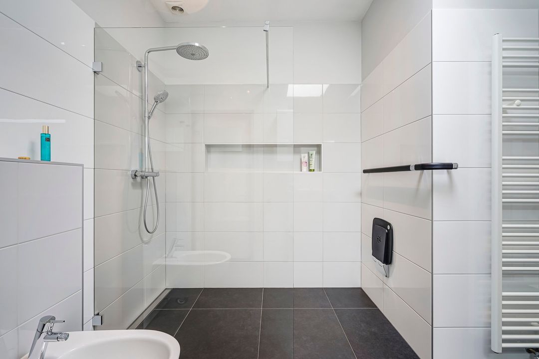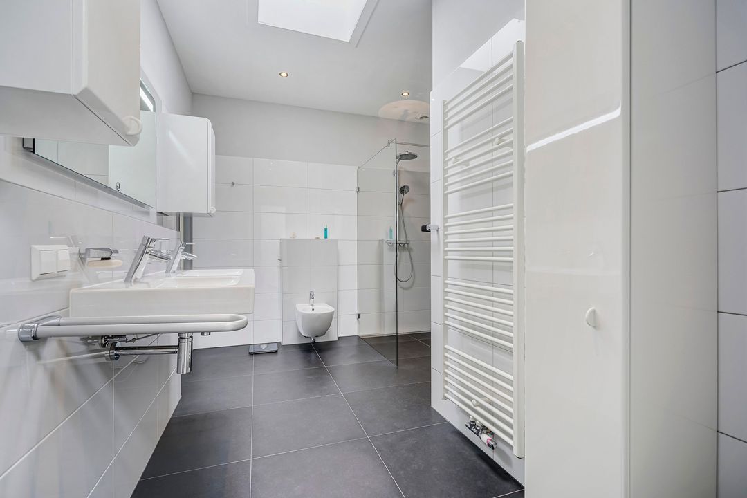 Tussengelegen ruime luxe badkamer voorzien van inloopdouche met glazen wand, bidet, dubbele wastafel, spiegel met ledverlichting en verwarming, vloerverwarming en handdoeken radiator.