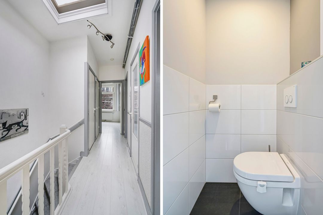 Overloop voorzien van dakraam, modern vrij hangend toilet voorzien van vloerverwarming, vaste kast met opstelplaats c.v.-ketel en aansluiting voor de wasmachine.