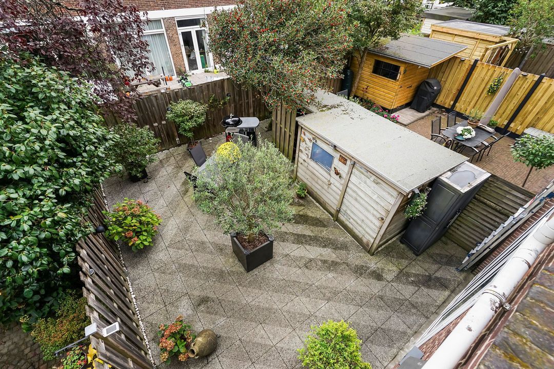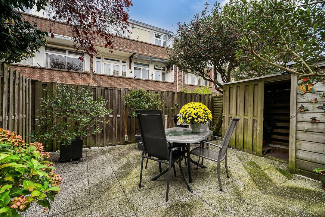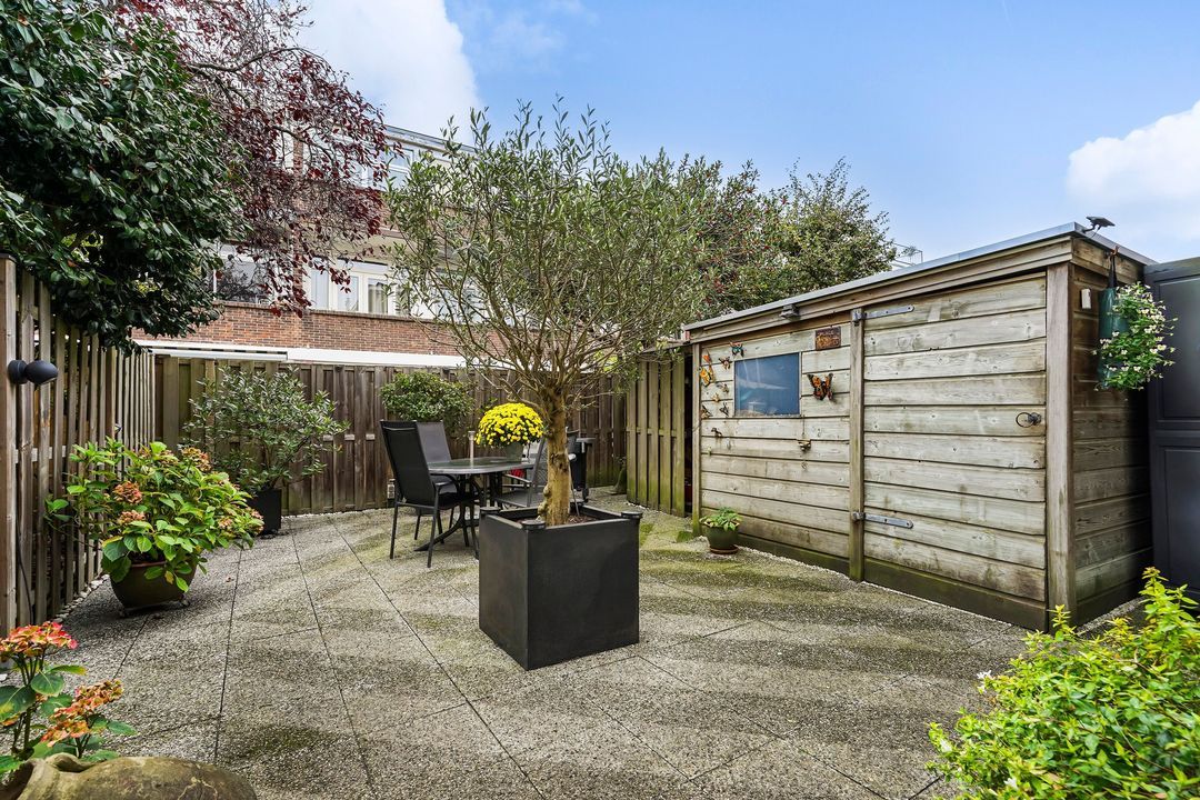 Double doors lead to the beautiful, sheltered northeast-facing back garden with a wooden shed.