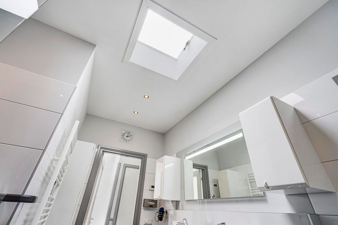 Landing with a skylight, modern toilet equipped with underfloor heating, built-in cupboard with position of the central heating system and connections for the washing machine.