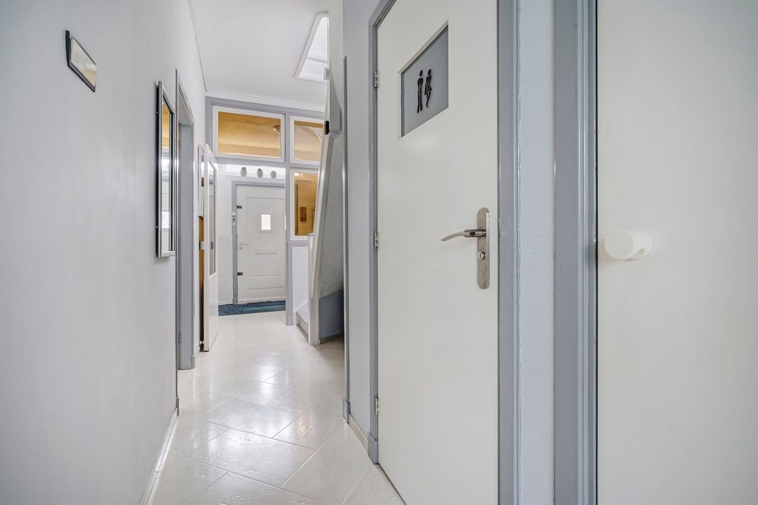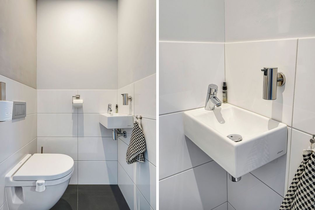 Through the well-maintained front garden, you enter the house, which features a hall with a draft door, hallway, modern toilet with underfloor heating and a hand basin, built-in cupboard.